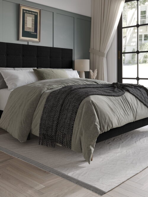 • Castle Place Elegant Square Tufted Linen Upholstered Full Platform Bed, Black