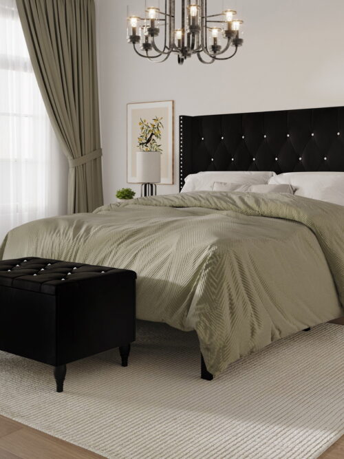 • Castle Place Button Tufted Wingback Velvet Upholstered Bed with Storage Bench, Black, King