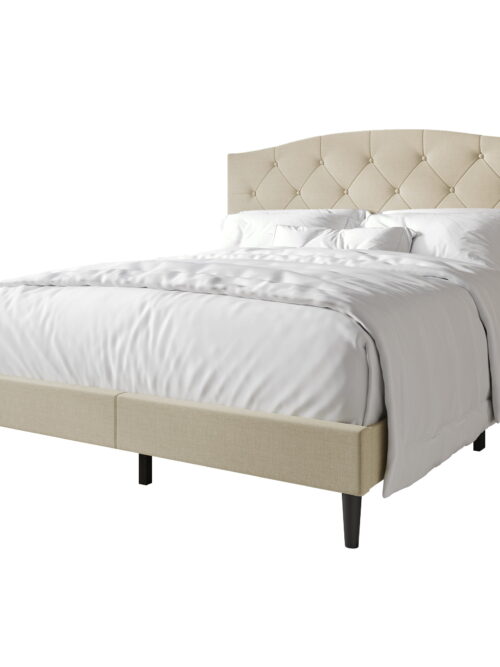 • Castle Place Button Tufted Linen Upholstered Platform Bed, Beige, Queen
