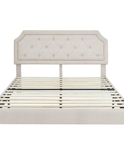 • AENKYO Queen Upholstered Platform Bed Frame, Button Tufted Faux Linen Headboard, Wood Slat Support, Beige