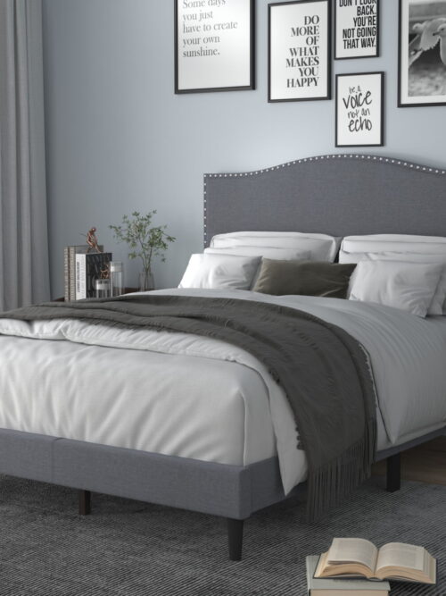 • Home Design Manuel King Upholstered Platform Bed Frame with Nailhead Trim and Foam-Filled Headboard, Gray, Easy assembly