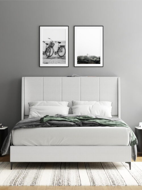• DHP Lamora Upholstered Wingback Bed Frame with USB, Queen, Light Gray Linen