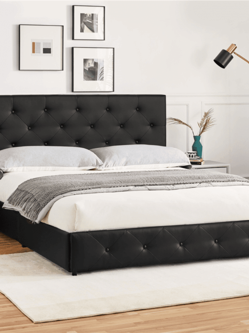 Renwick Diamond Button-Tufted Upholstered Platform Bed with Storage, Adult, Black, Queen
