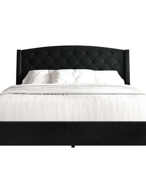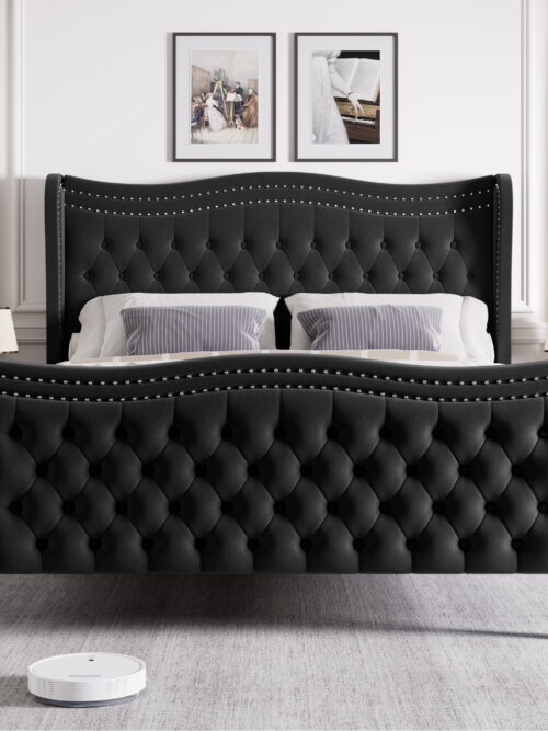 • Gewnee Queen Bed Frame with 52'' Tall Headboard Velvet Upholstered Bed Frame,Double Nail & Wingback Design Platform Bed Frame.Black