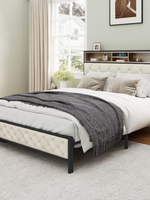 • Dextrus Queen Size Footboard Metal Slats Bed Frame ,No Box Spring Needed,Beige