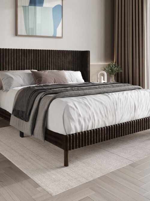 • Castle Place Contemporary Corduroy Velvet Upholstered Wingback Queen Bed, Brown