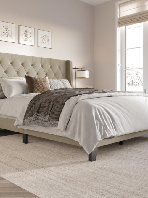 • Home Design Medford Queen Tufted Upholstered Panel Bed with Wingback Headboard and Button Tufting, Dark Beige, Easy Assembly