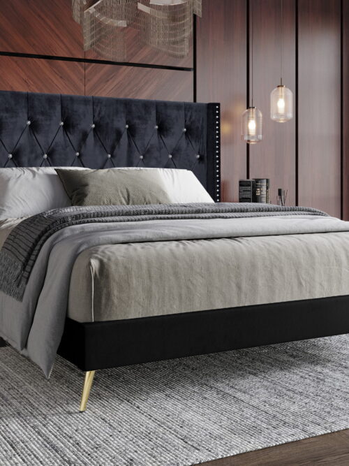 • Castle Place Velvet Platform Bed, King Size, Black with Storage