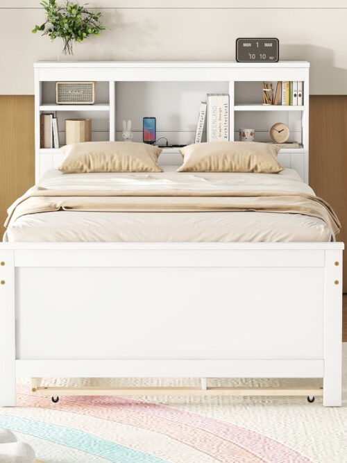 • Euroco Wood Twin Size Platform Bed with Storage Headboard, Trundle Bed and 3 Drawers, USB Charging and Shleves for Kids Teens, White