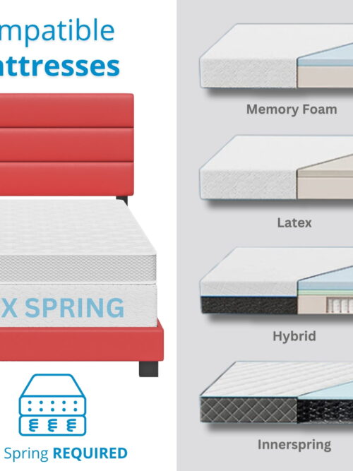 • Boyd Sleep Napoli Red Faux Leather Full Size Fully Upholstered Platform Bed Frame with Adjustable Headboard, Qualified Box Spring or Foundation Required for Use