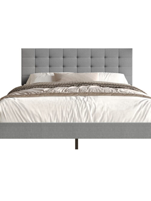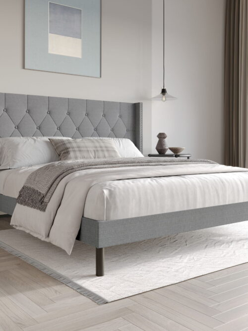• GIANNA King Size Platform Bed – Fabric Upholstered, Sturdy Wood Slats, No Box Spring Needed, Grey