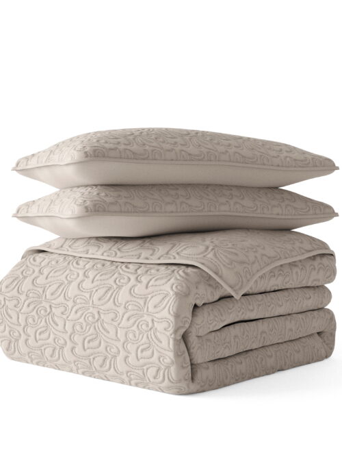• Noble Linens 3 Piece Latte Floral Stitch Quilt Set, King / CalKing