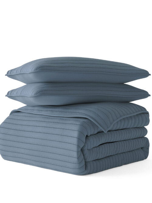 • Noble Linens 3 Piece Dusk Blue Stripe Stitch Quilt Set, Queen / Full