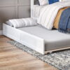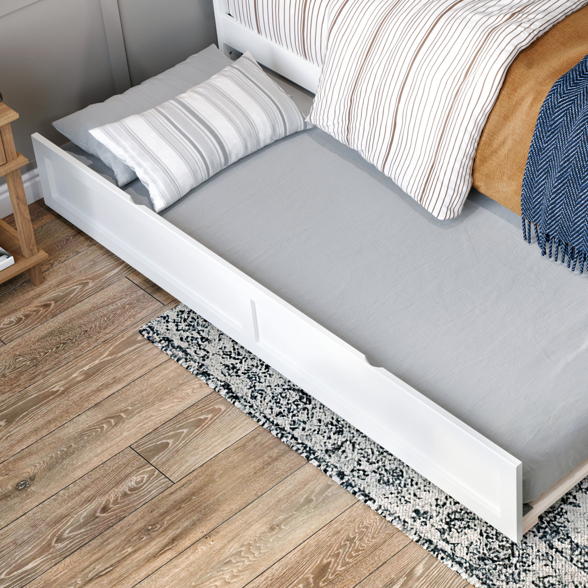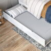 - Trundle can be placed on either side of the bed and easily glides over wood flooring and carpet