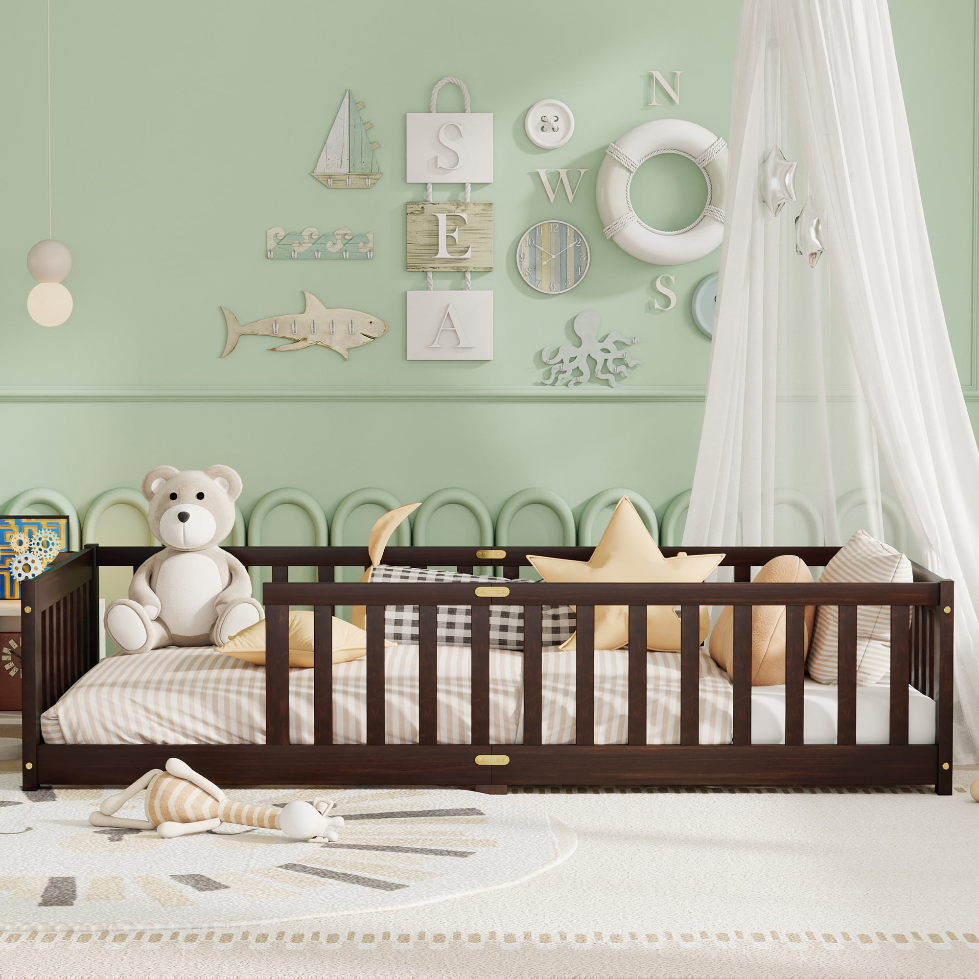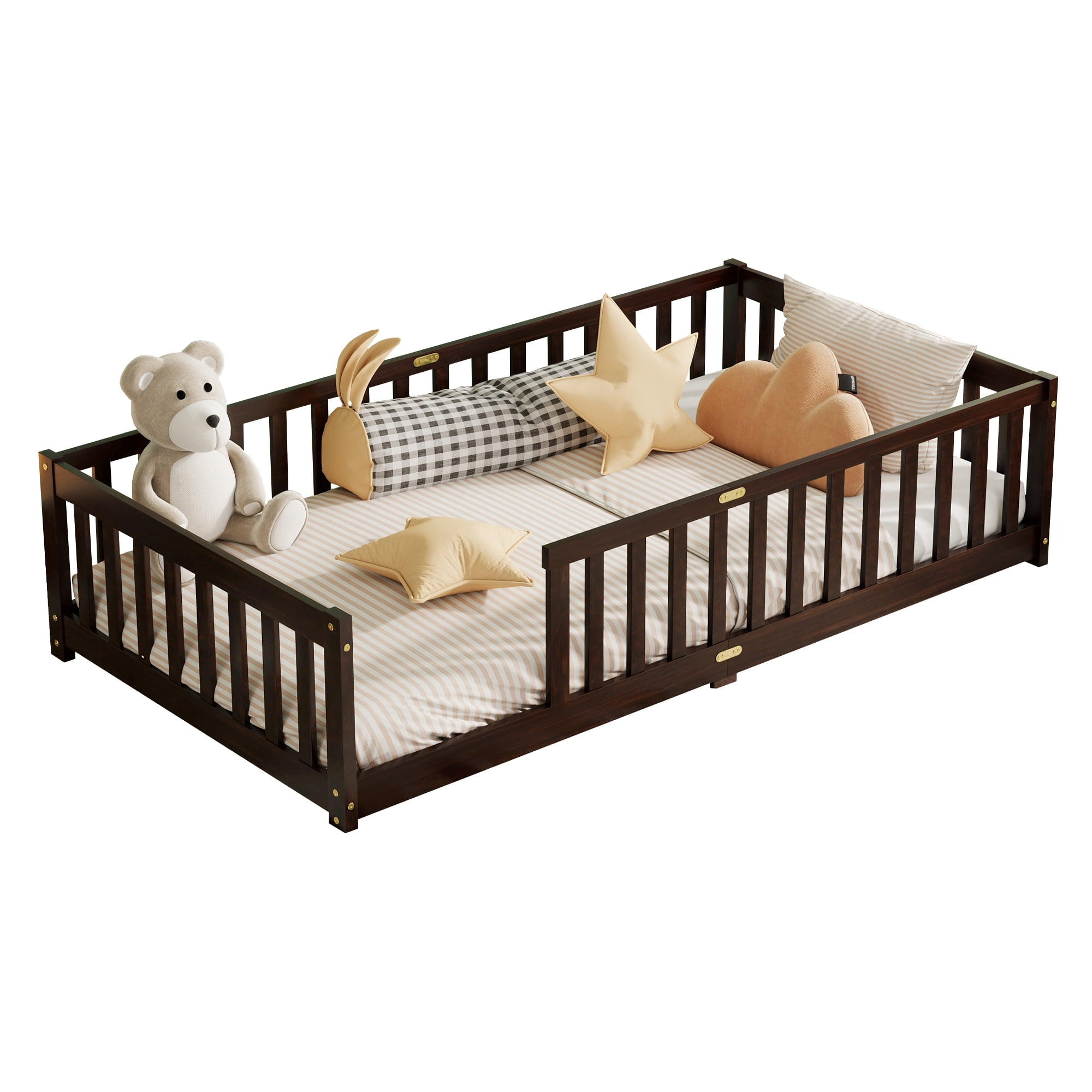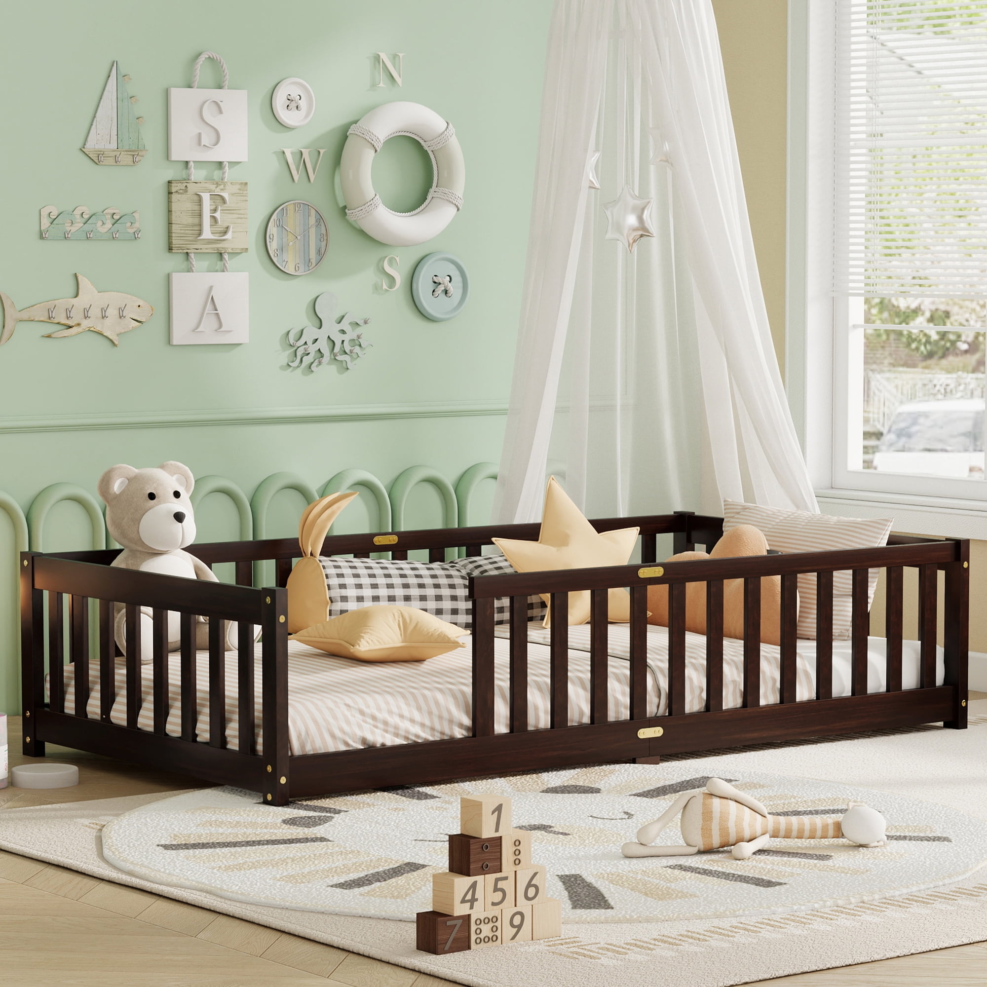 Upgrade your child’s room with the Alvantor Twin Size Montessori Floor Bed with Rails, a thoughtfully designed toddler bed that supports independent sleep and play. Crafted from solid rubber wood, this kids floor bed is low to the ground, making it ideal for toddlers learning to get in and out on their own. With a full surrounding guardrail, this floor bed for kids keeps your little one secure all night. Its Montessori-inspired design promotes freedom of movement and self-reliance while creating a safe and cozy sleep environment. Whether used as a twin size toddler bed, reading nook, or play zone, this bed brings comfort and creativity into your child’s room. Thanks to its sturdy wood construction and 7 durable slats, it offers excellent support without the need for a box spring. Assembly is fast and easy with detailed instructions included. Delivered in a single box, this twin bed for kids is a great choice for growing children and modern parents alike.