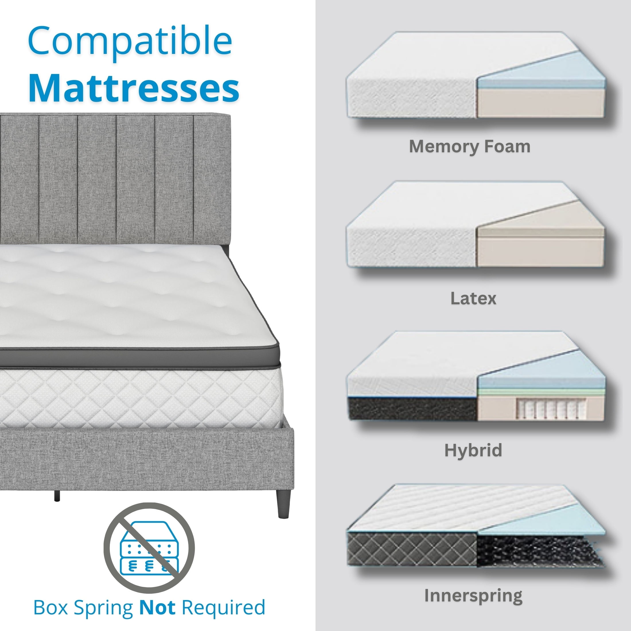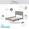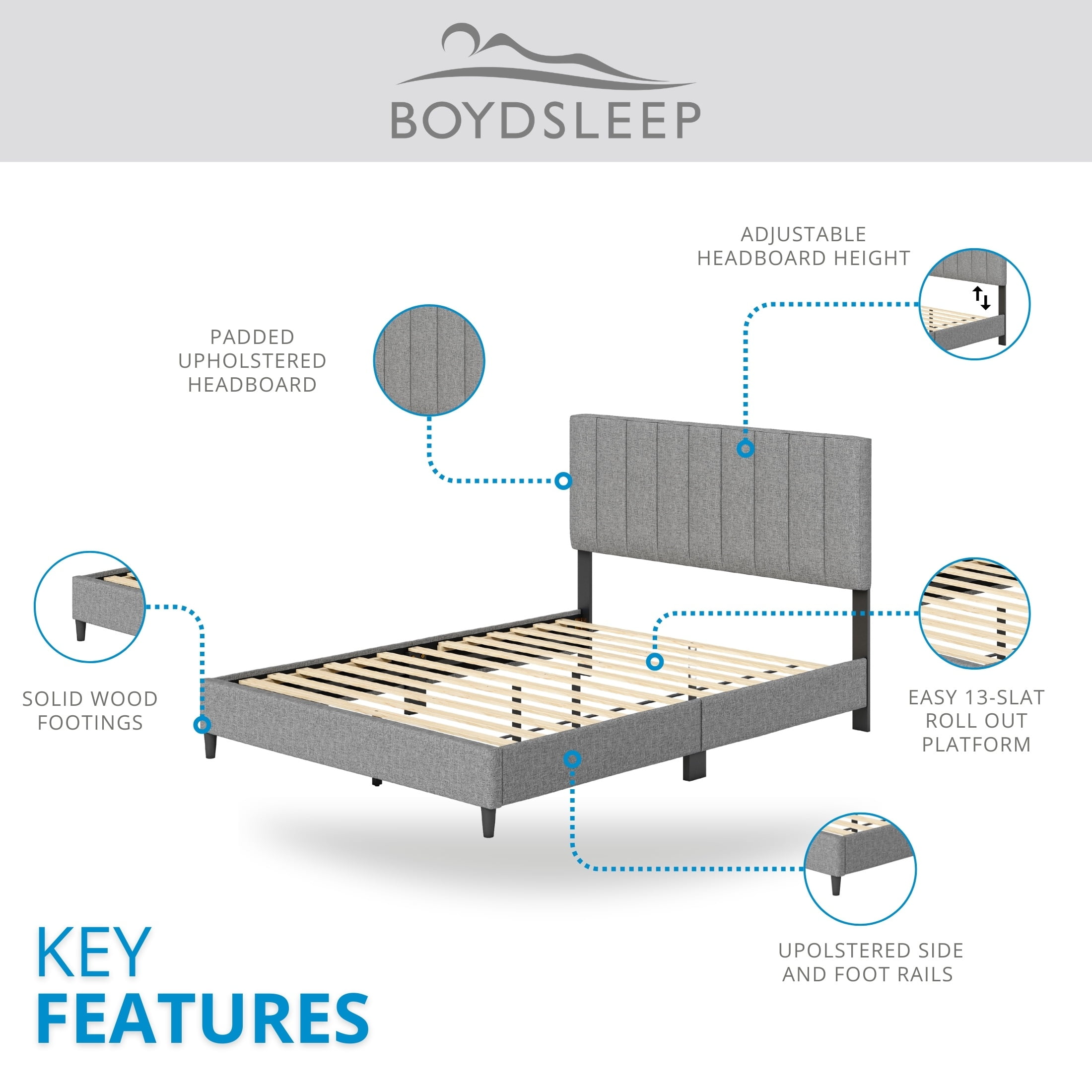 - Modern Upholstered Platform Bed: The Boyd Sleep Leah bed frame features a tufted linen upholstered adjustable headboard, ensuring a tailored fit to a variety of mattress thicknesses.