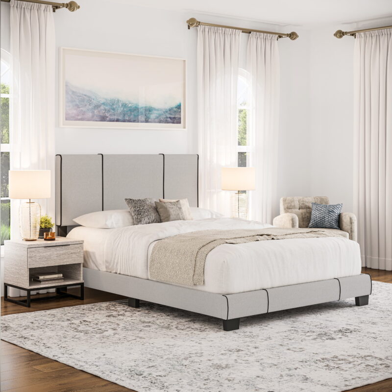 Introducing the Lucena Upholstered Platform Bed, a modern bed frame from Boyd Sleep that fits your personal style. This upholstered bed features contrast piping on its headboard and footboard for a neat, tailored finish. The 4 slat support system is designed to be used with a box spring or foundation, which allows your mattress to sit at a comfortable height off the ground. Built to last, Lucena uses ultra-sturdy, solid wood center legs for additional support and mattress longevity. The adjustable headboard can fit a variety of mattress heights and adds an elegant focal point to your bedroom or guest room. The Lucena from Boyd Sleep calls for easy one-person assembly in under 30 minutes using the provided tools and hardware; Philips screwdriver required (not included). Compatible with most mattress types, including memory foam, hybrid innerspring, and latex mattresses. This sleek panel bed is offered in a variety of stylish finishes and is available in Queen, Full, and Twin sizes. Qualified box spring or foundation required for use.