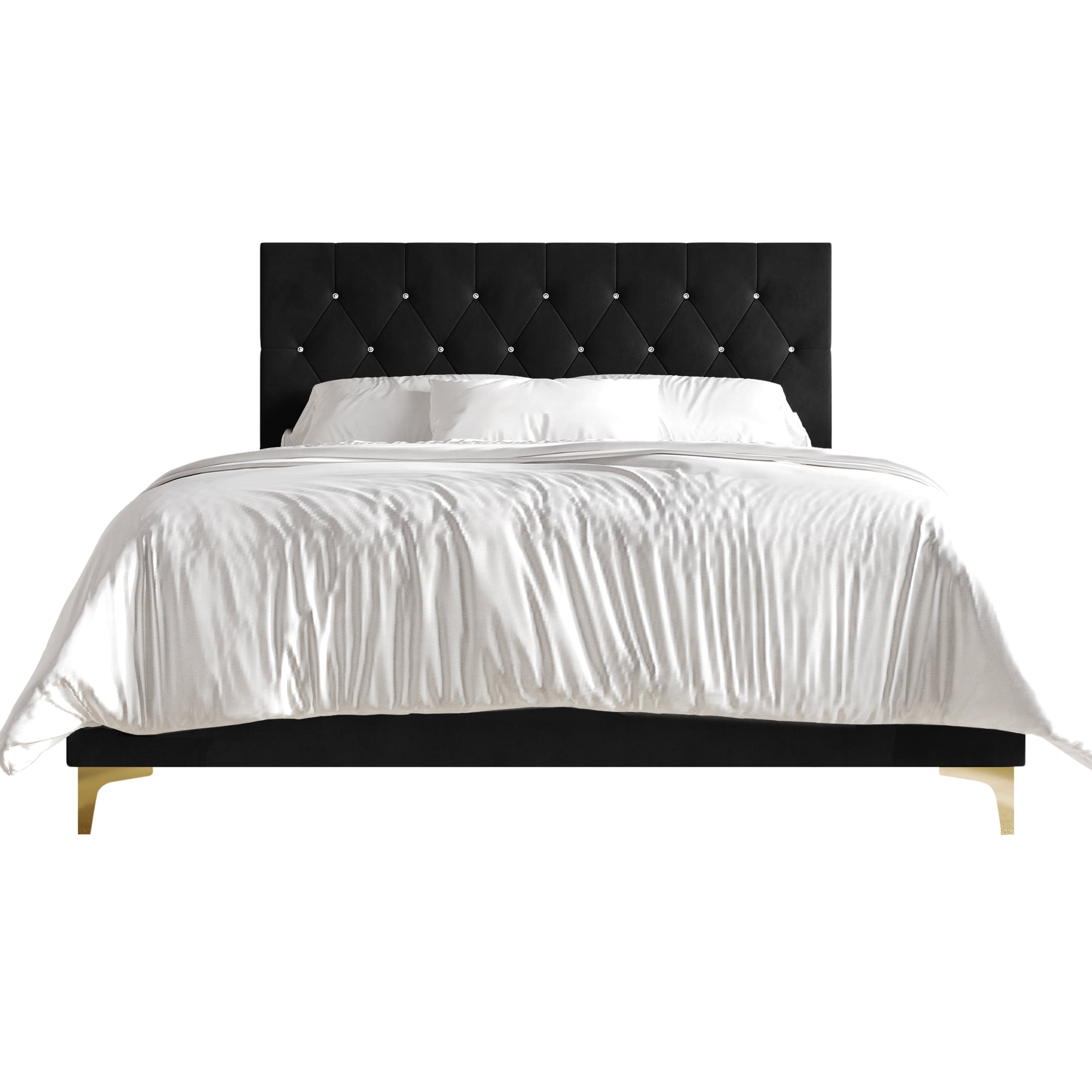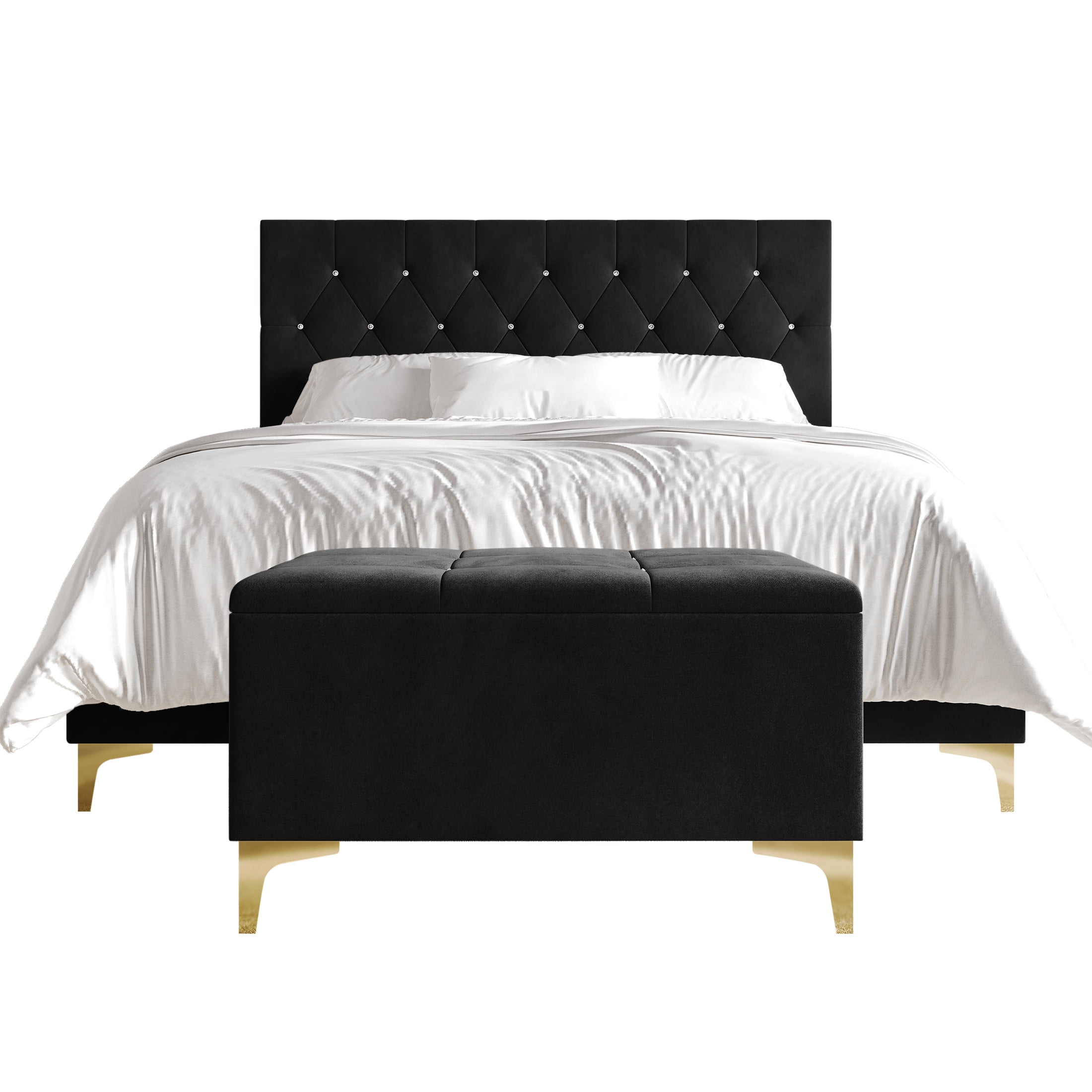 Elevate your bedroom with our modern bed set, featuring a bed and matching storage bench. Adorned with diamond-tufted buttons for subtle glamour, this set is crafted from solid rubberwood, MDF, and LVL, upholstered in luscious 100% polyester velvet. Supported by sophisticated gold metal legs, it’s available in Light Grey and Black, catering to Twin to King sizes. The storage bench offers versatile seating and extra storage, optimizing space. With a recommended mattress thickness of 8-12 inches, easy assembly, and convenient one-box shipping, this set combines convenience with elegant style for a seamless bedroom upgrade. This bed includes four slats, and a separate box spring is necessary for use (box spring sold separately). Choose the ideal size for your space: – Twin: 80.58L x 43.18W x 45.51H (Weight Capacity: 300Lbs) – Full: 80.58L x 58.16W x 45.51H (Weight Capacity: 400Lbs) – Queen: 85.70L x 64.46W x 45.51H (Weight Capacity: 500Lbs) – King: 85.70L x 80.22W x 45.51H (Weight Capacity: 600Lbs) – Bench: 30.34L x 19.11W x 19.11H (Weight Capacity: 200Lbs)
