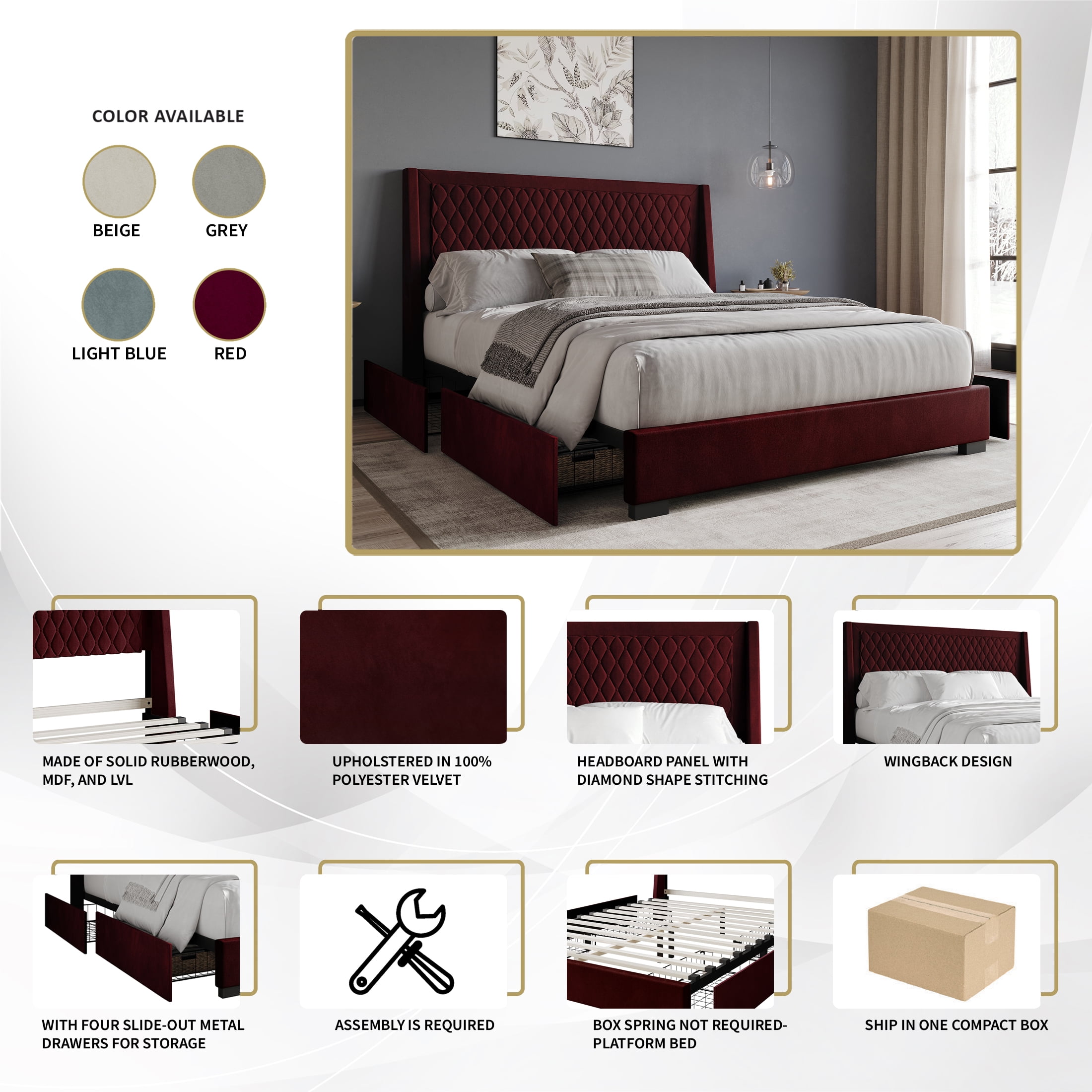 Transform your sleep space with this sophisticated adult bed, featuring a headboard with diamond-shaped stitching that adds a touch of elegance. Built from a blend of solid rubberwood, MDF, and LVL, it ensures robust durability and stability. Equipped with four slide-out metal drawers for convenient storage, and covered in 100% polyester velvet for a luxurious feel. With 12 solid wood slats, this bed eliminates the need for a box spring and supports mattresses from 8 to 12 inches. Choose from stylish colors like Grey, Beige, Light Blue, and Red, and sizes including Full, Queen, and King. Ships in one box for easy handling and includes all necessary hardware and clear assembly instructions. Choose the ideal size for your space: – Full: 79.59L x 57.72W x 41.17H (Capacity: 400 lbs) – Queen: 84.71L x 64.03W x 41.17H (Capacity: 500 lbs) – King: 84.71L x 79.79W x 41.17H (Capacity: 600 lbs)