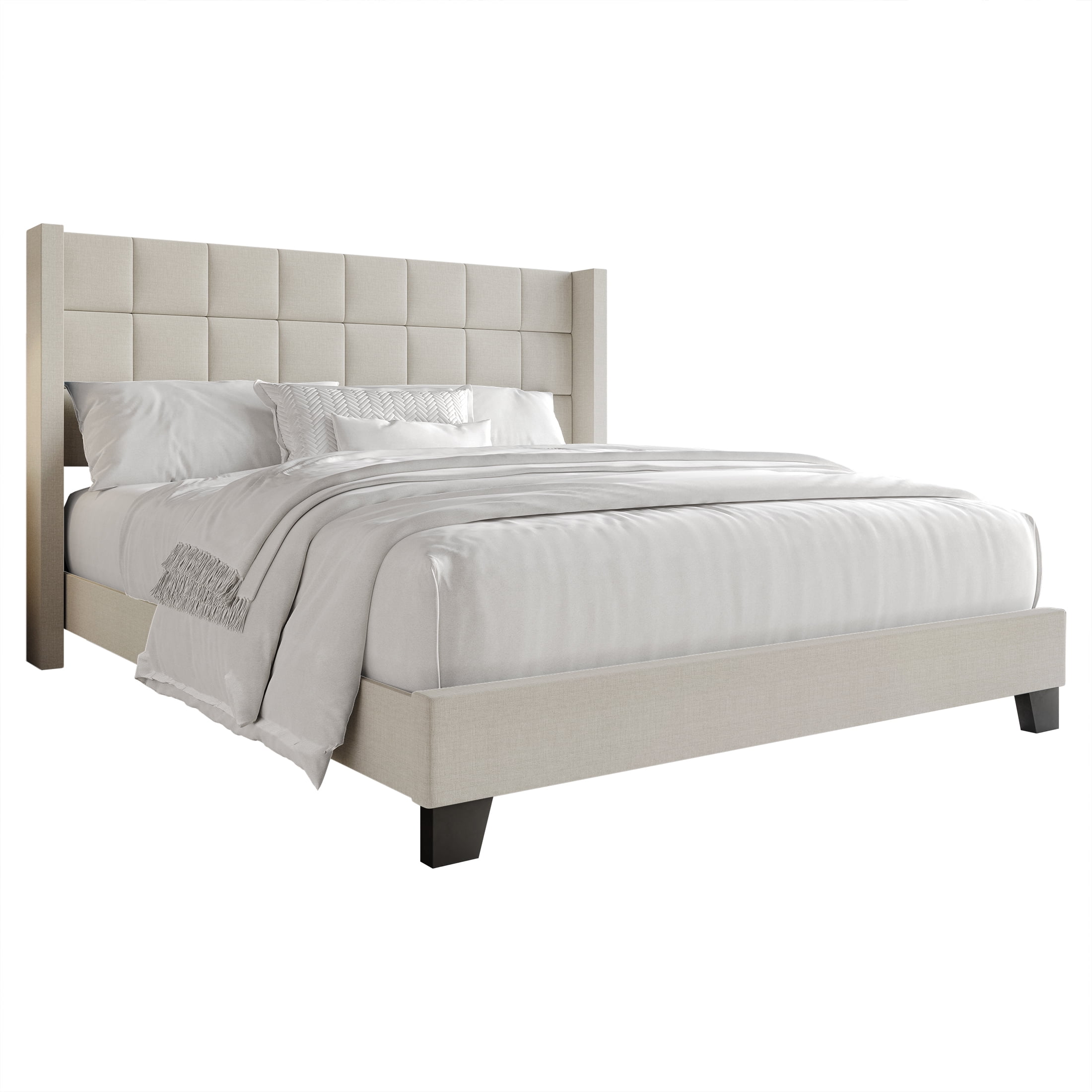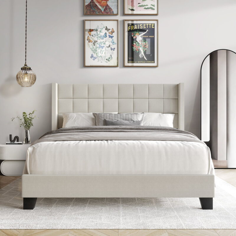 Upgrade your bedroom with this chic adult bed, showcasing a wingback headboard with modern square stitching for a stylish and contemporary look. Constructed from solid rubberwood, MDF, and LVL, this bed offers robust durability and stability. The 100% polyester linen fabric upholstery adds a touch of sophistication, while the foam-padded headboard provides excellent comfort for lounging or reading. Featuring four slats, this bed requires a box spring (sold separately) for optimal mattress support. Available in Twin, Full, Queen, and King sizes and color choices like Warm Grey, Light Grey, and Blue. Assembly is easy with clear instructions, and the bed ships in a single box for convenient delivery. Choose the ideal size for your space: – Twin: 79.00L x 44.52W x 48.07H (Capacity: 300 lbs) – Full: 79.00L x 59.50W x 48.07H (Capacity: 400 lbs) – Queen: 83.73L x 65.80W x 48.07H (Capacity: 500 lbs) – King: 83.73L x 81.56W x 48.07H (Capacity: 600 lbs)