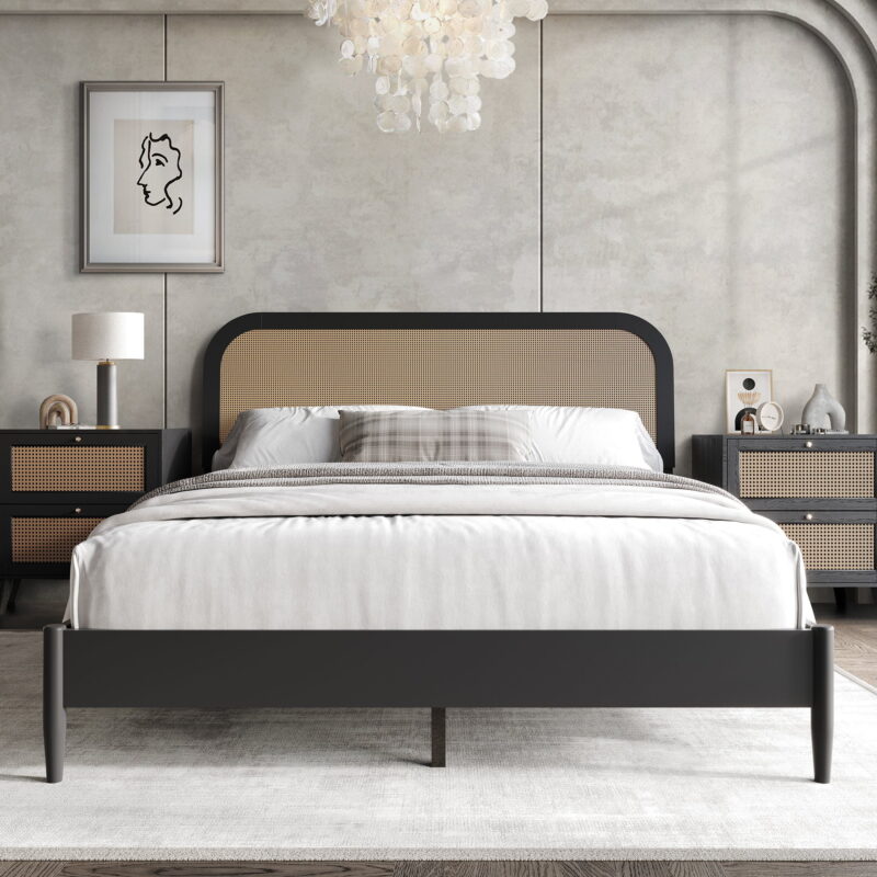 Enhance your bedroom with this elegant adult platform bed, featuring curved headboard ends and a central coffee cane design. Crafted from solid rubberwood and an MDF wood frame, the bed is durable and sturdy. Available in Twin, Full, Queen, or King sizes, it provides optimal support with 12 slats and center support legs (four for Full/Queen, eight for King). No box spring is needed, and the bed suits mattresses from 8 to 12 inches thick. Enjoy straightforward assembly with clear instructions. The bed ships in one box for easy delivery. Great bedroom addition to any home decor style. Choose the ideal size for your space: – Twin: 79.20L x 41.96W x 40.98H (Capacity: 300 lbs) – Full: 79.20L x 57.13W x 40.98H (Capacity: 400 lbs) – Queen: 84.12L x 63.24W x 40.98H (Capacity: 500 lbs) – King: 84.12L x 79.20W x 40.98H (Capacity: 600 lbs)