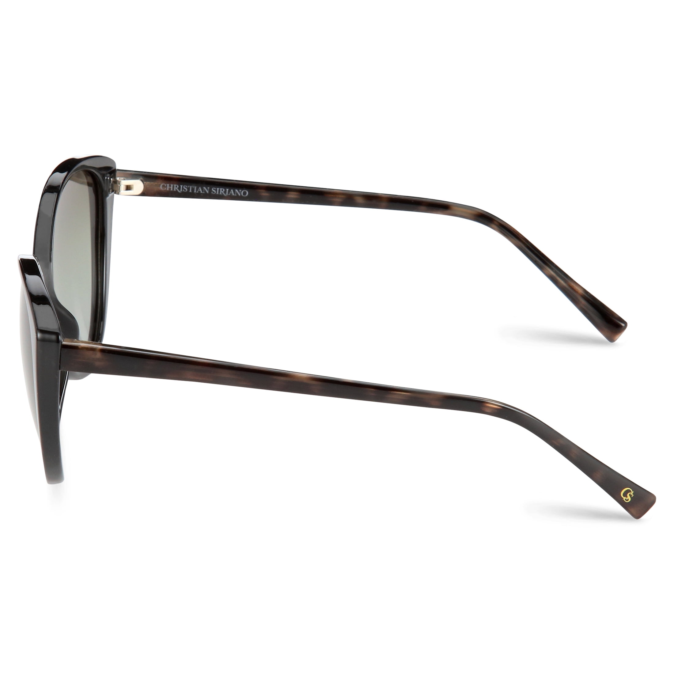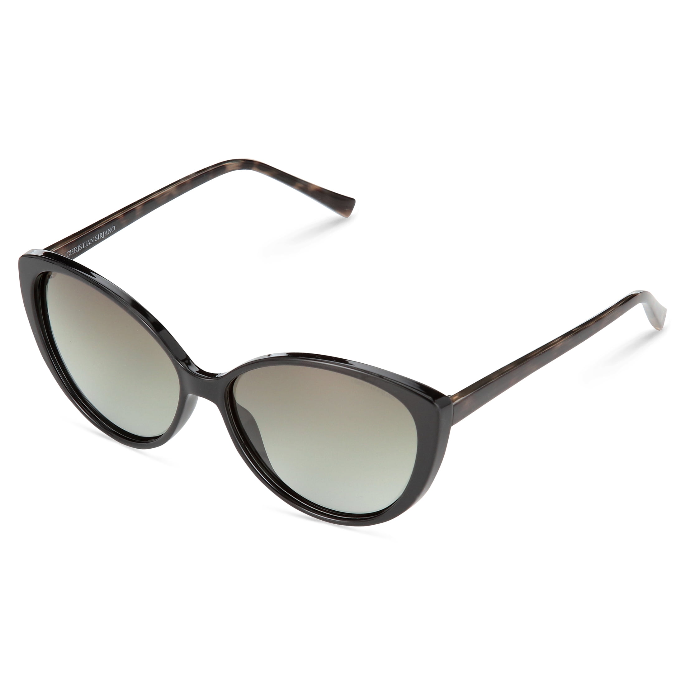 • The BIANCA sunglass is an edgy cateye with slim temples. The frame front is black with grey tortoise temples. The CS logo appears on the temple tips and an engraved CS logo appears on the upper lens.