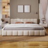 Experience luxurious comfort and modern elegance with this upholstered bed, featuring plush chenille fabric for a soft, velvety texture. The checkerboard-patterned headboard adds a sophisticated touch, making it a stunning focal point for any bedroom. Designed in a versatile beige tone, this bed complements various interior styles while creating a warm and inviting atmosphere. Available in Queen and King sizes, it offers spacious yet cozy sleeping arrangements. Crafted for both durability and comfort, this bed ensures optimal support for a restful night’s sleep.