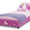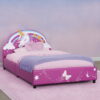 This Unicorn Upholstered Twin Bed by Delta Children features the finest mythical creature around. An enchanted choice for your child, it features a colorful unicorn and rainbow on the headboard and three-dimensional butterfly on the footboard. Fully upholstered in faux leather with a sturdy and durable hardwood frame, this kids’ bed creates a magical and safe sleep space that is comfier than you can even imagine. No box spring required. Mattress not included.