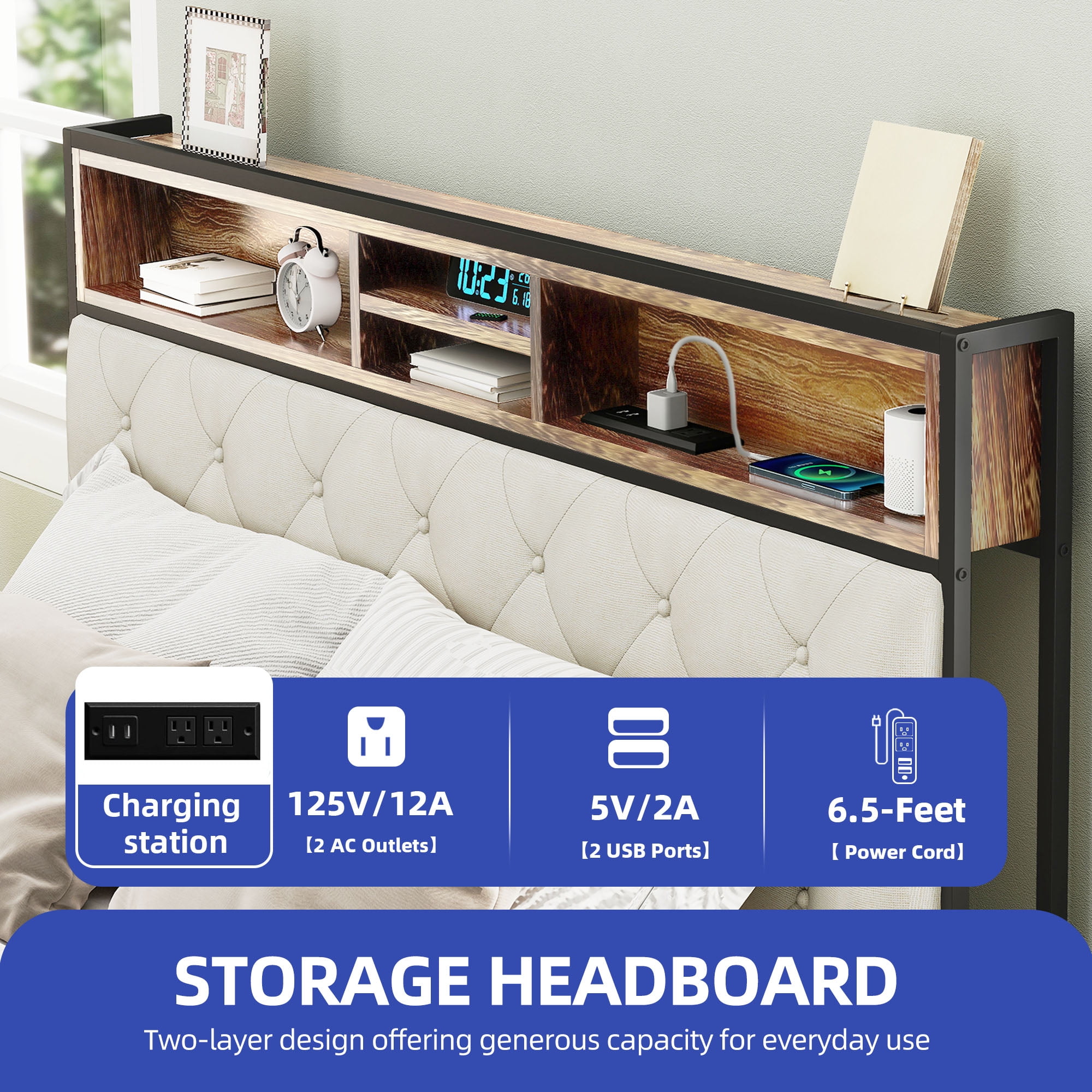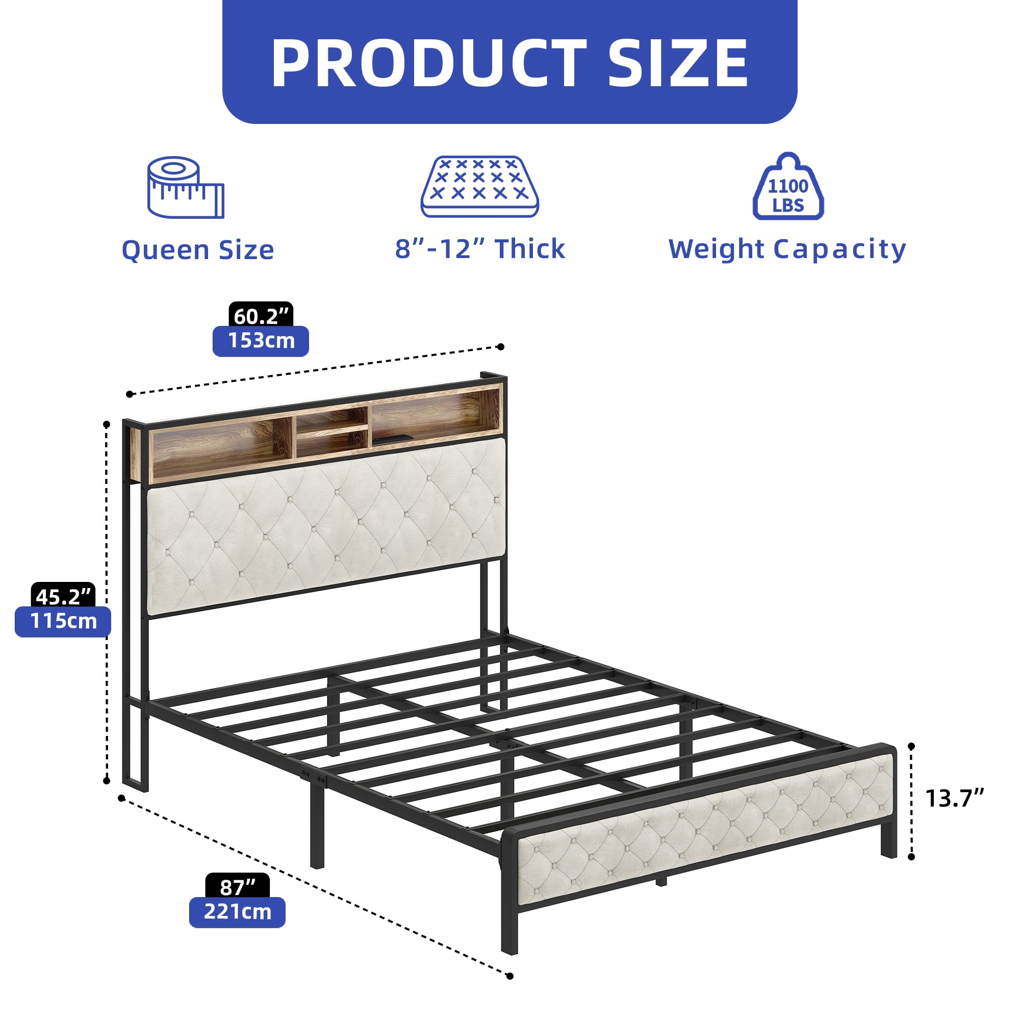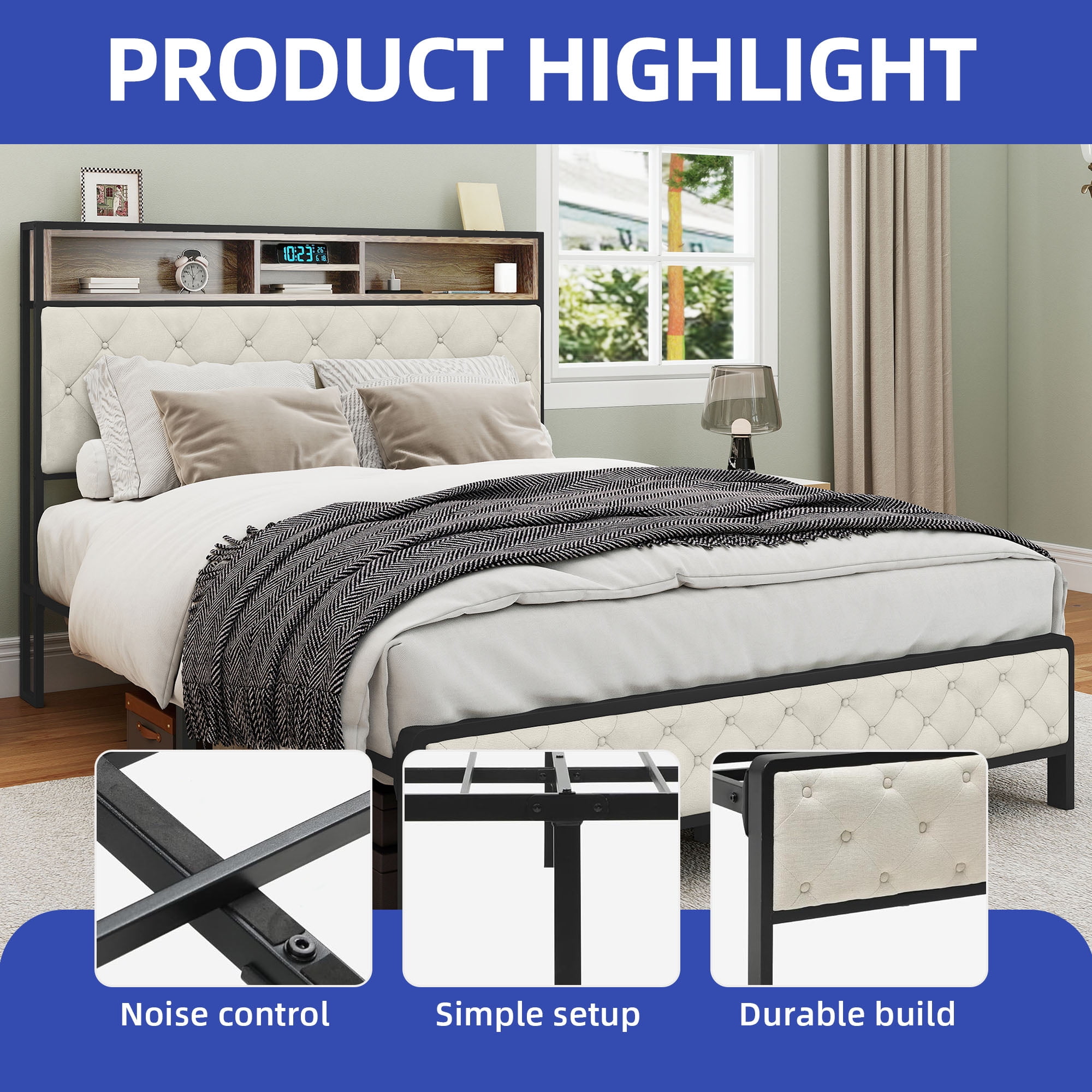 Now you can effortlessly charge your devices while lying in bed, keeping them within easy reach. But that’s not all – the headboard also provides additional storage space for your magazines, phones, beloved photos, and decorative items, ensuring everything stays organized and within arm’s reach.Embrace the timeless charm of Industrial Retro Style with our bed frame’s unique design. The high-quality MDF board with a wood grain finish, combined with the beige headboard and footboard. Additionally, our bed frame provides 10.2 inches of under-bed storage space, allowing you to keep extra belongings organized and out of sight.Practicality meets comfort with our Thickened Storage Headboard. This unique feature serves as a 2-in-1 solution, offering both practical storage and a comfortable backrest experience.