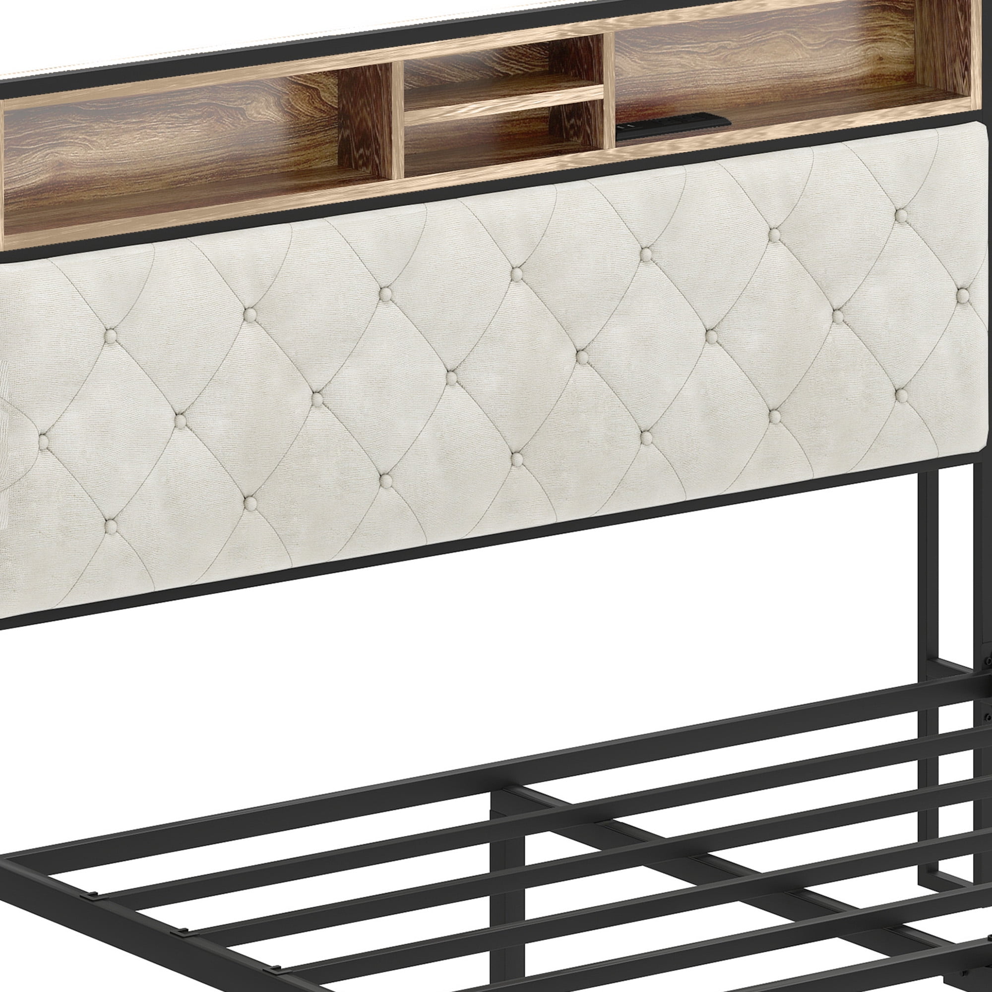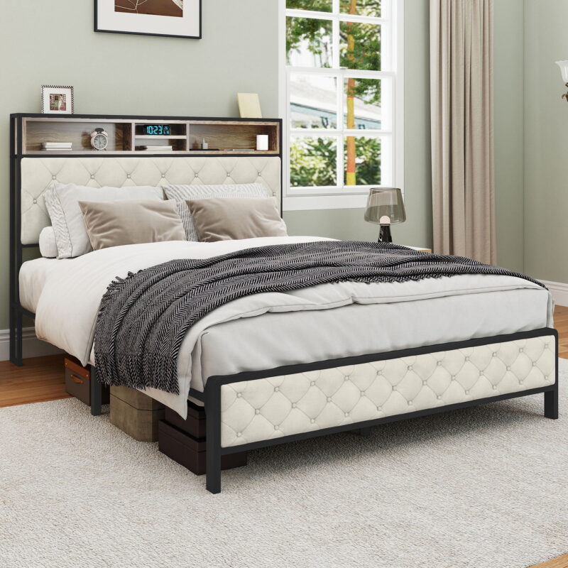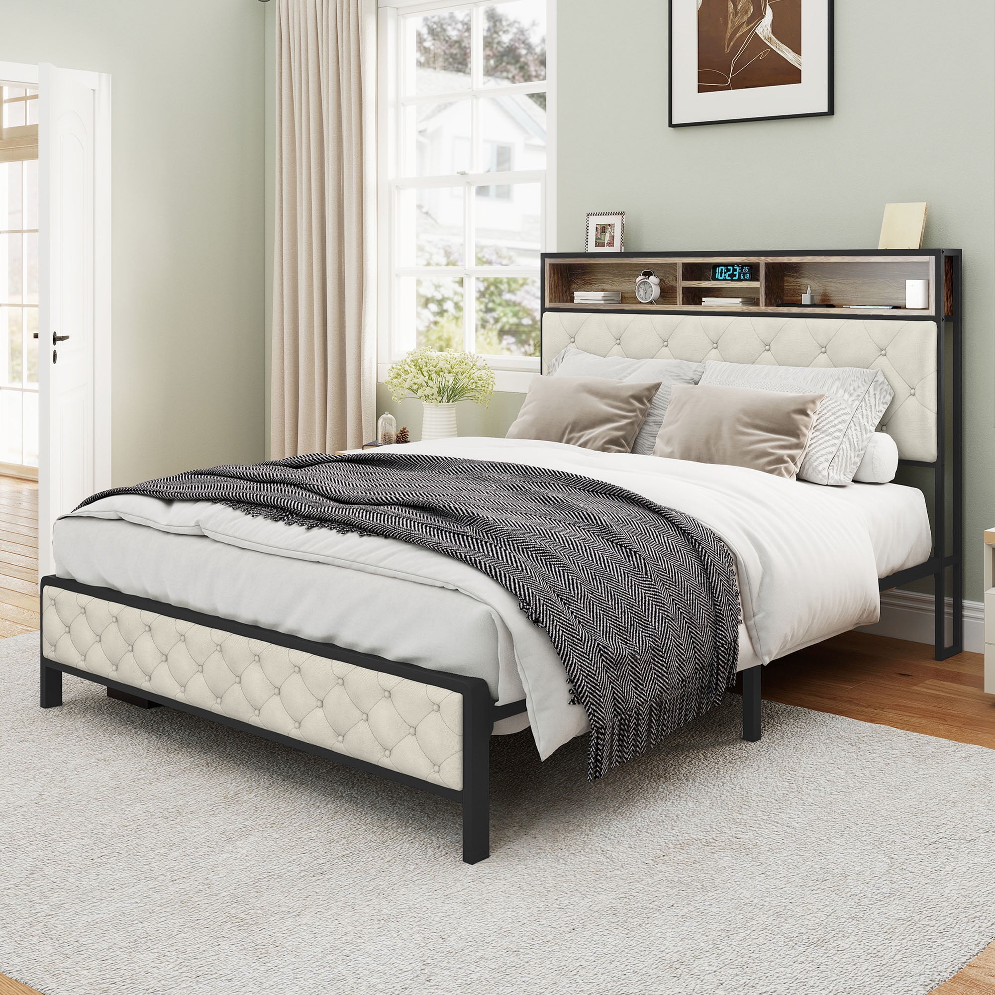 Now you can effortlessly charge your devices while lying in bed, keeping them within easy reach. But that’s not all – the headboard also provides additional storage space for your magazines, phones, beloved photos, and decorative items, ensuring everything stays organized and within arm’s reach.Embrace the timeless charm of Industrial Retro Style with our bed frame’s unique design. The high-quality MDF board with a wood grain finish, combined with the beige headboard and footboard. Additionally, our bed frame provides 10.2 inches of under-bed storage space, allowing you to keep extra belongings organized and out of sight.Practicality meets comfort with our Thickened Storage Headboard. This unique feature serves as a 2-in-1 solution, offering both practical storage and a comfortable backrest experience.
