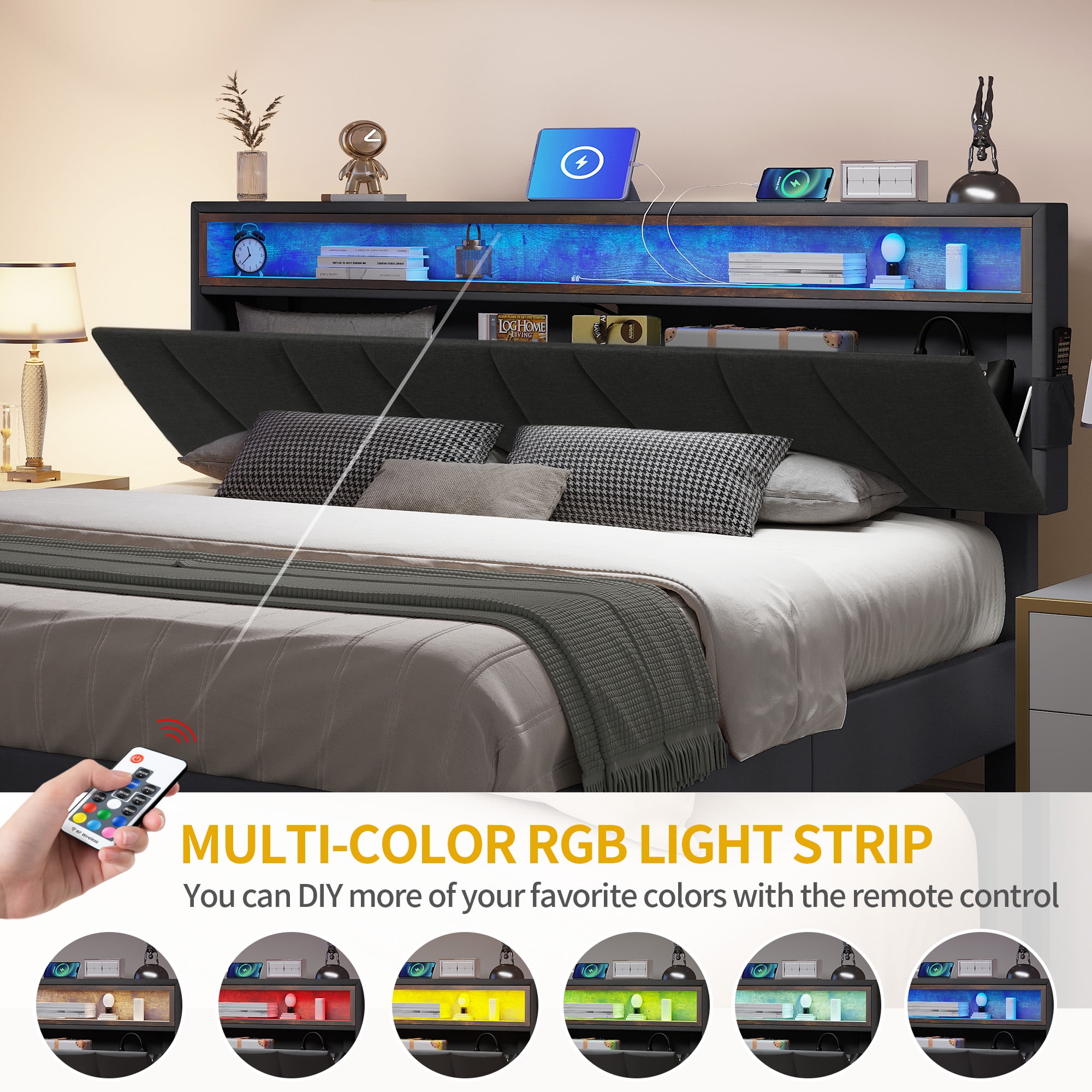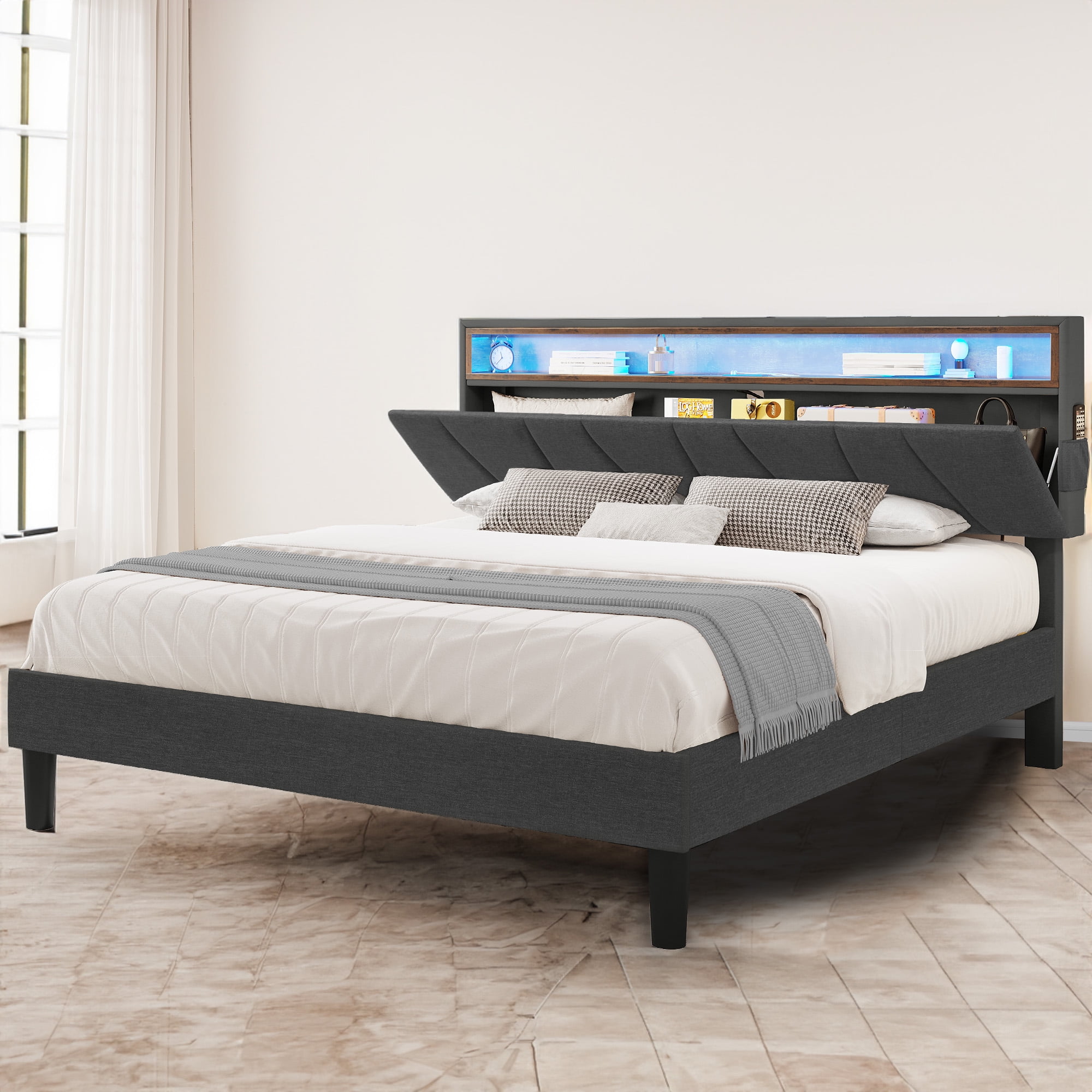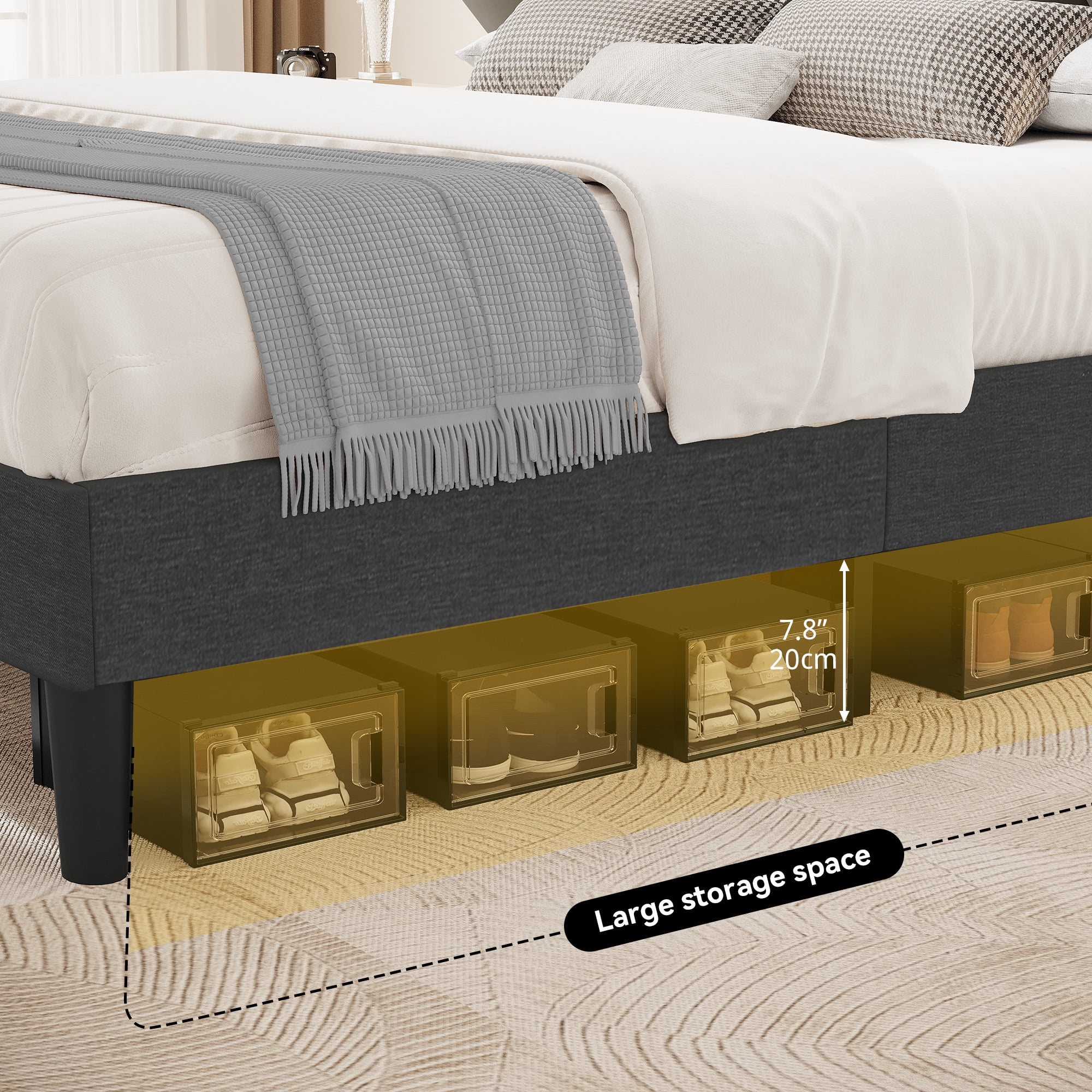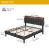 Our product goes beyond ordinary queen bed frames, showcasing a headboard with ingenious storage options. The internal storage capacity provides ample room for bedding, books.Enveloped in sumptuous grey fabric upholstery. The soft fabric texture perfectly complements the overall design.With a meticulously designed structure that’s capable of accommodating weights up to 1100 lbs.