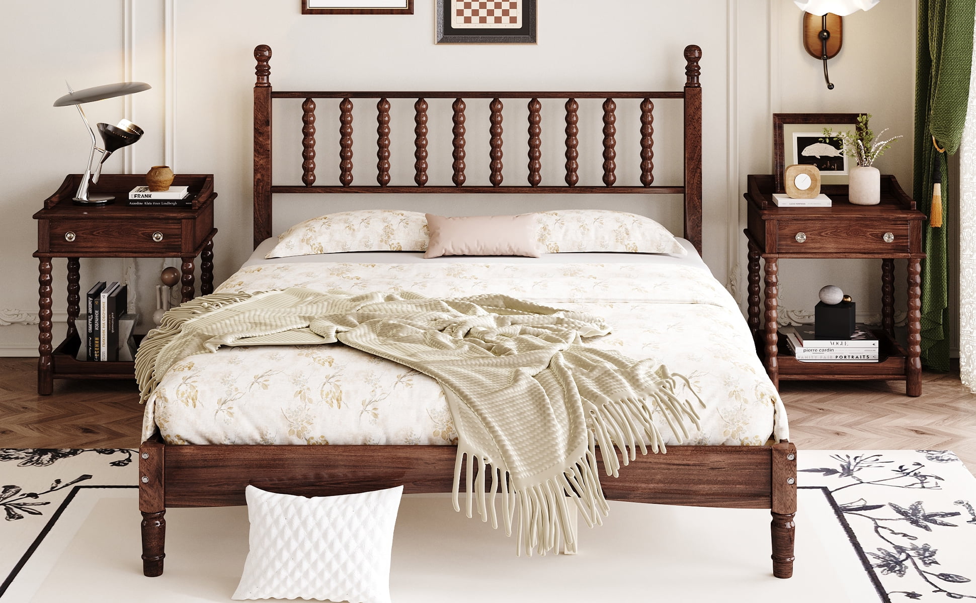 - Elegant Retro Design: This queen-size platform bed features a charming gourd-shaped headboard, adding a touch of vintage sophistication to your bedroom decor.