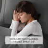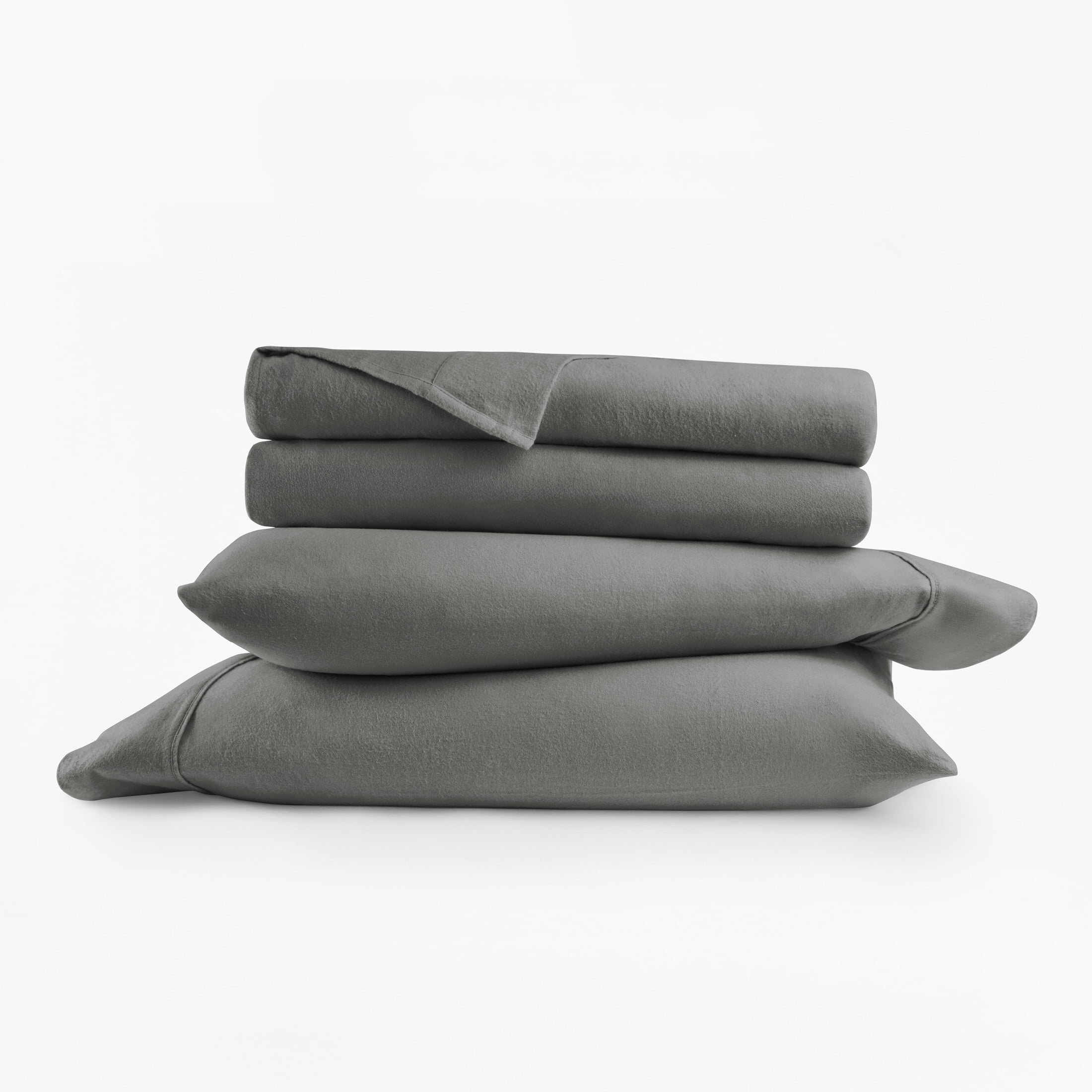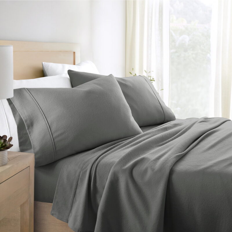 - Solid flannel sheet set comes in blush, light gray, gray, ivory, light navy, and white