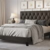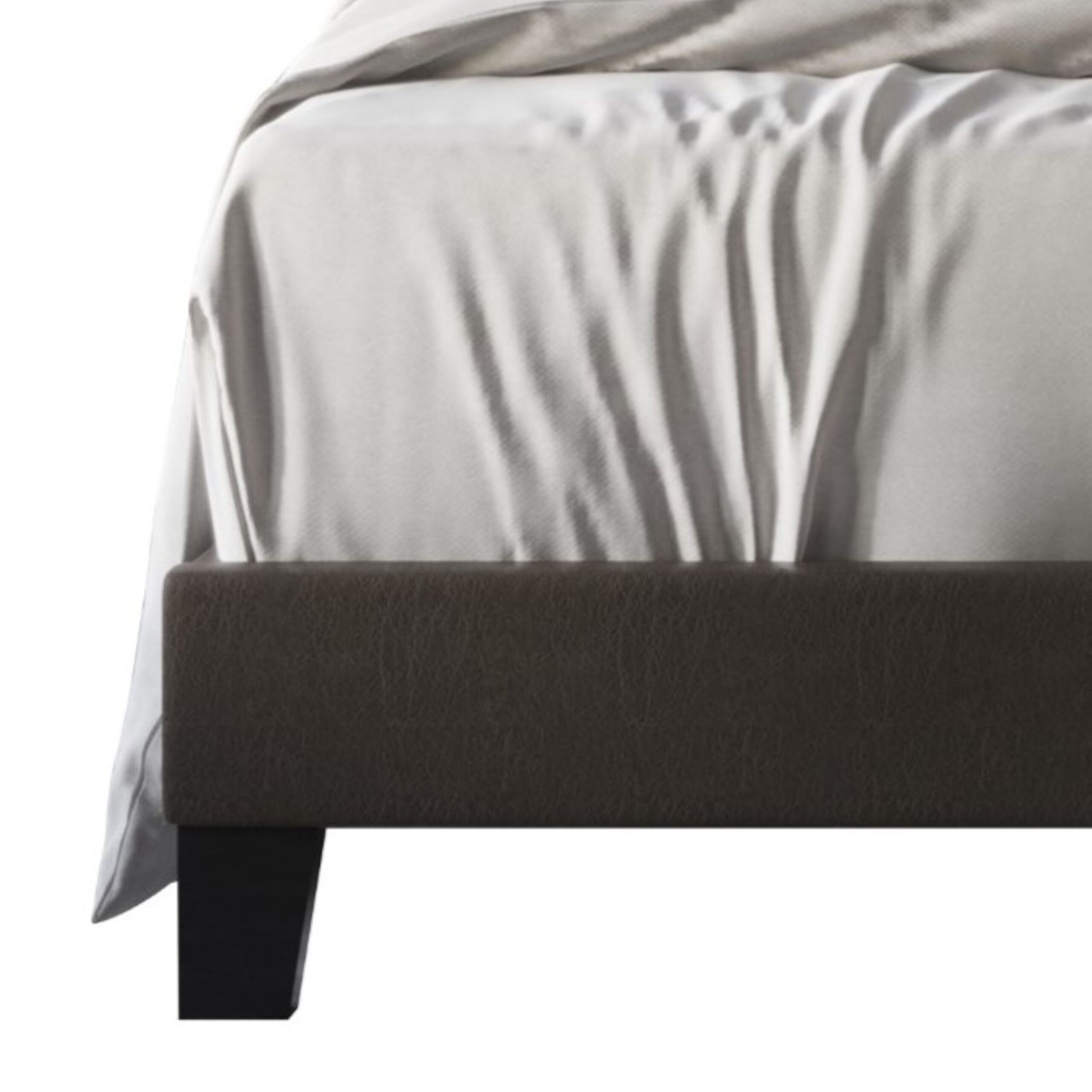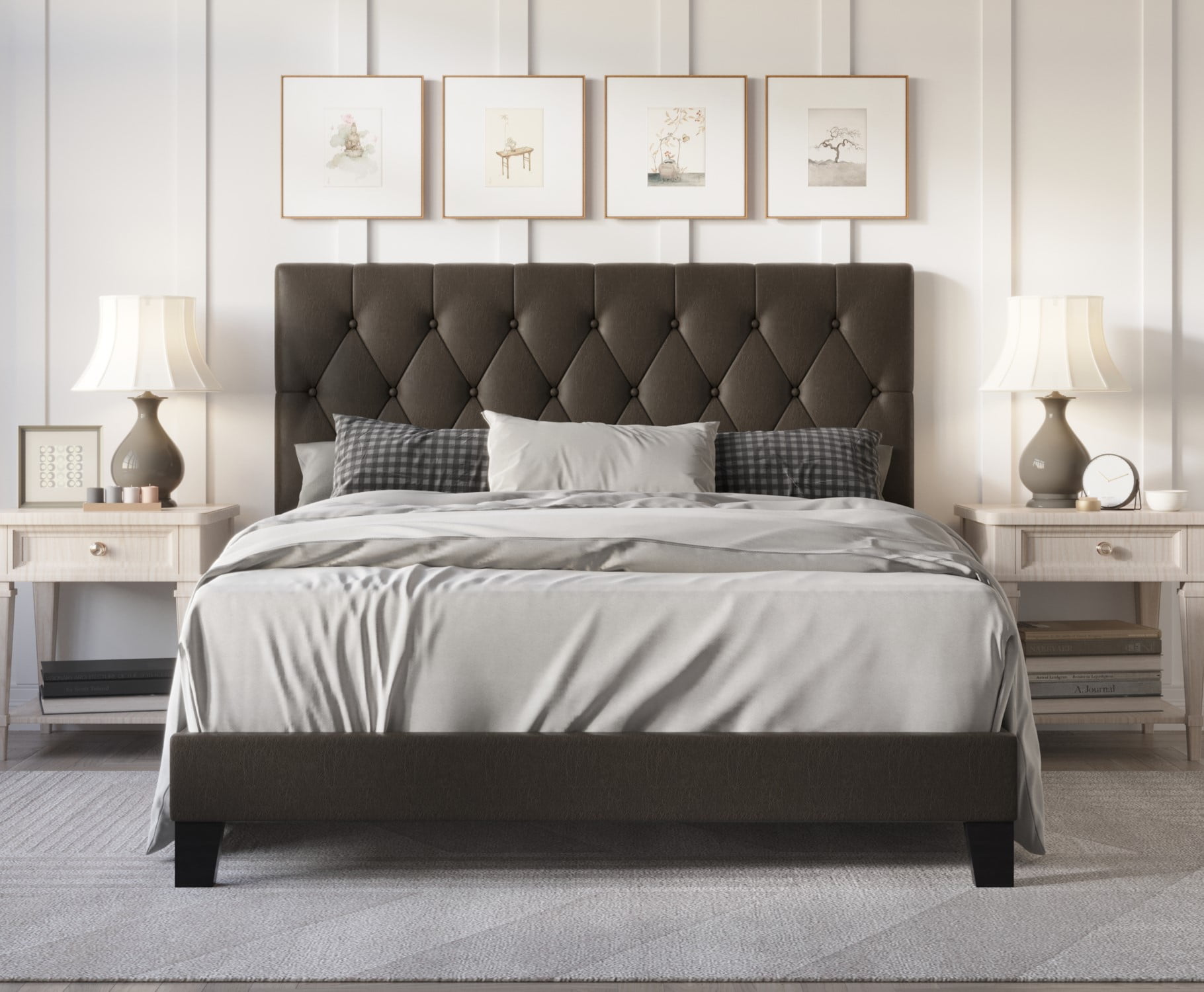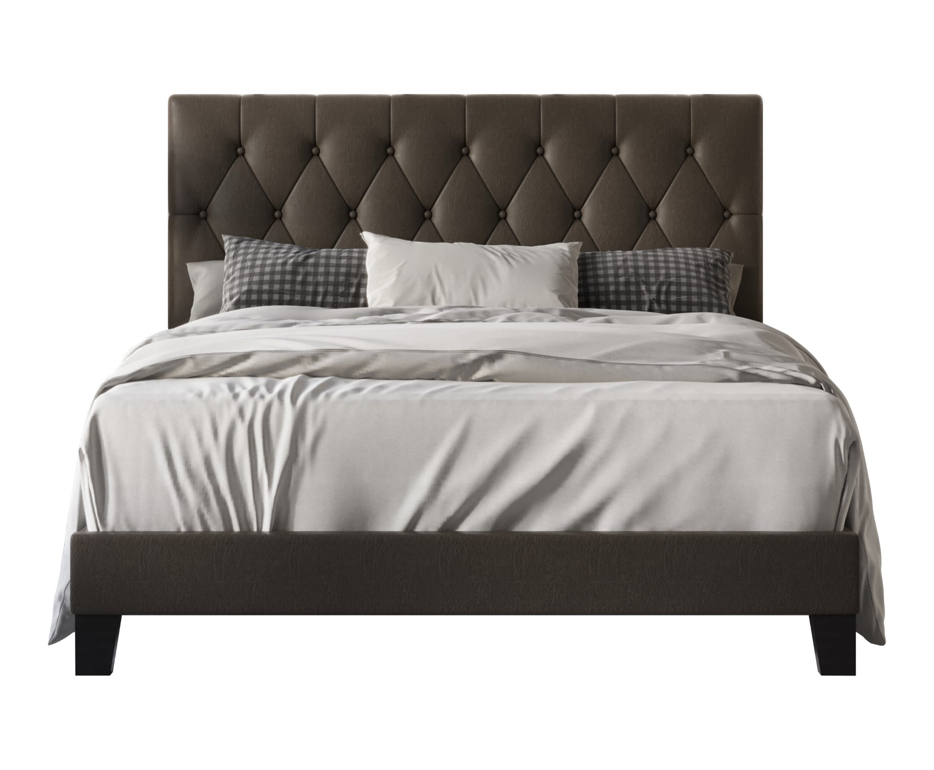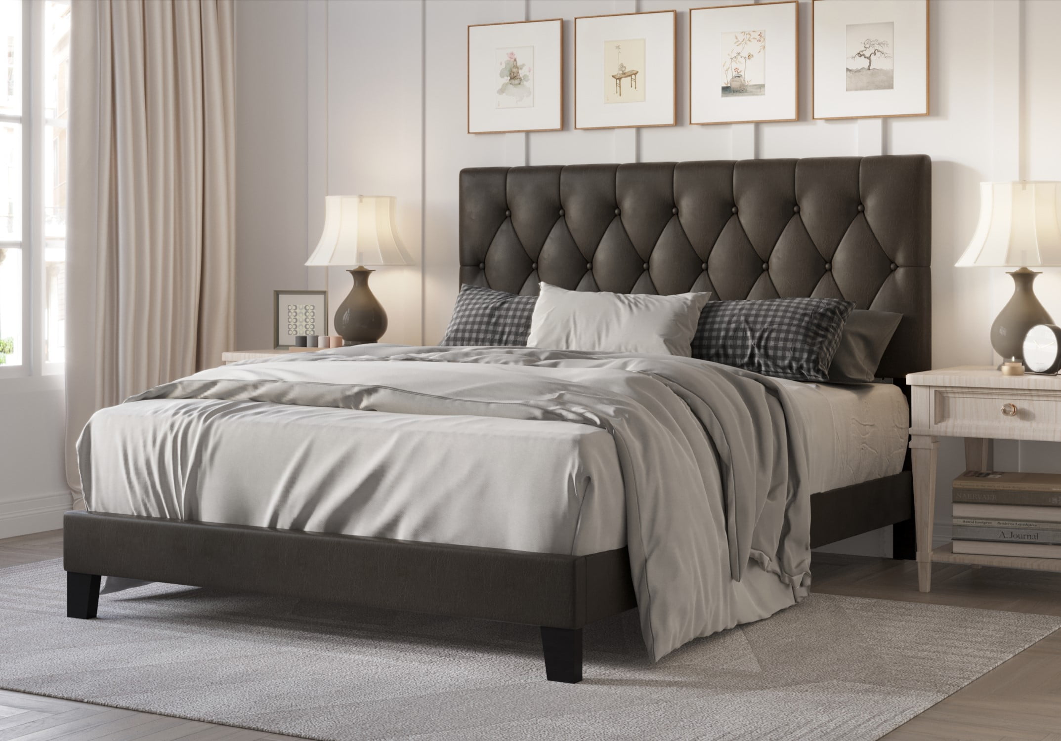 Upgrade your bedroom or guest room with this charmingly designed platform bed, a perfect blend of elegance and comfort. It features a rectangular headboard adorned with sophisticated button tufting that brings an element of timeless style to your space. Wrapped in luxurious faux leather, the bed exudes a refined and polished appearance, instantly elevating your bedroom decor. The foam-padded headboard ensures a comfortable backrest, making it ideal for lounging, reading, or watching TV in bed. Its modern and clean lines make it easily fits into both contemporary and modern bedroom designs.