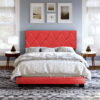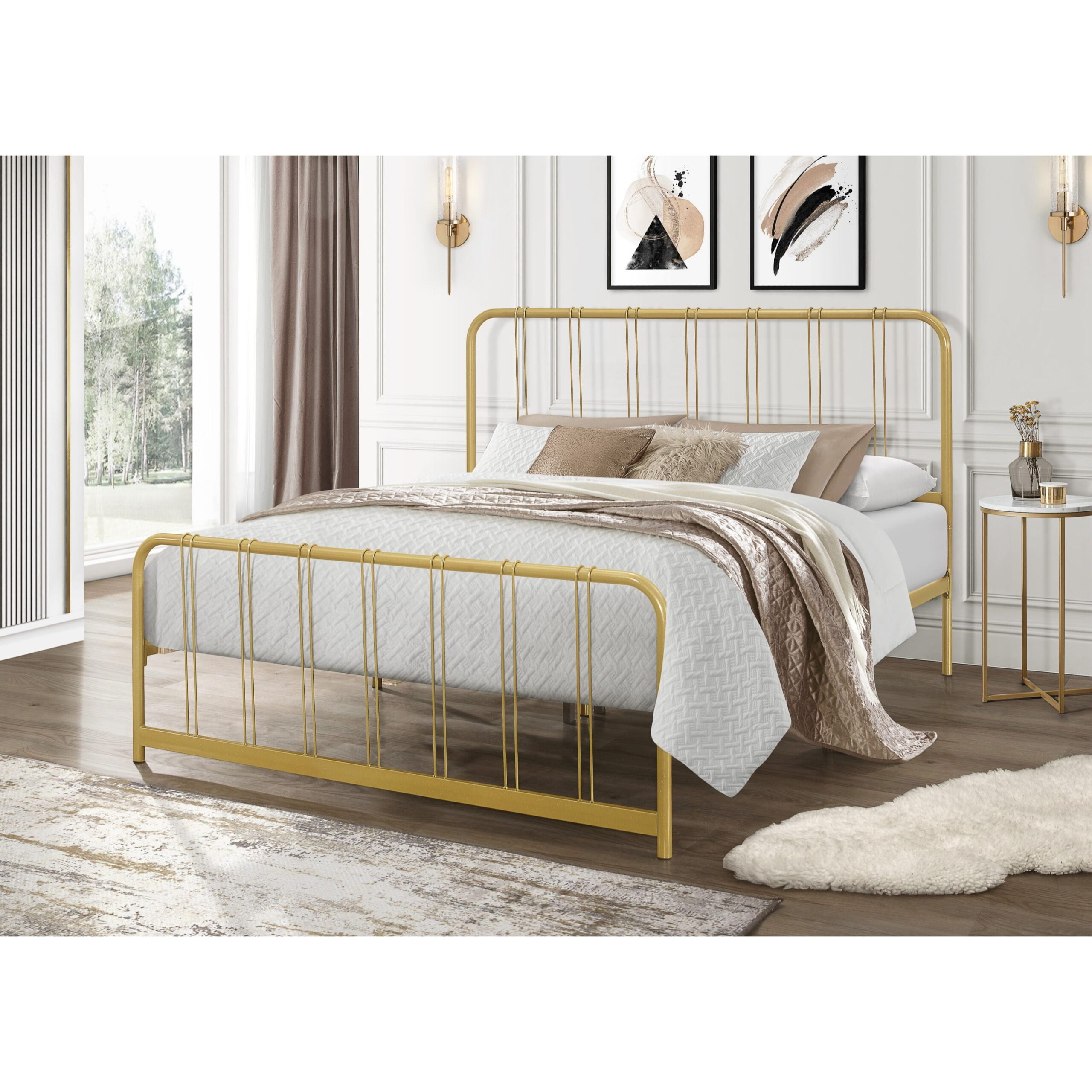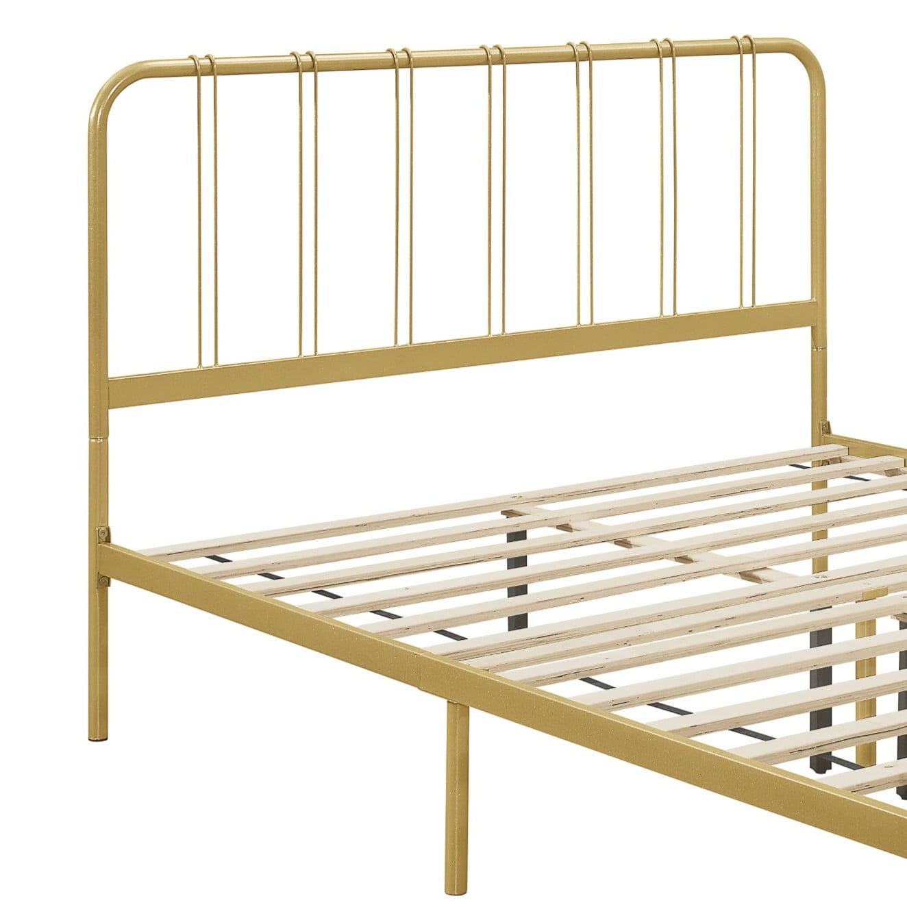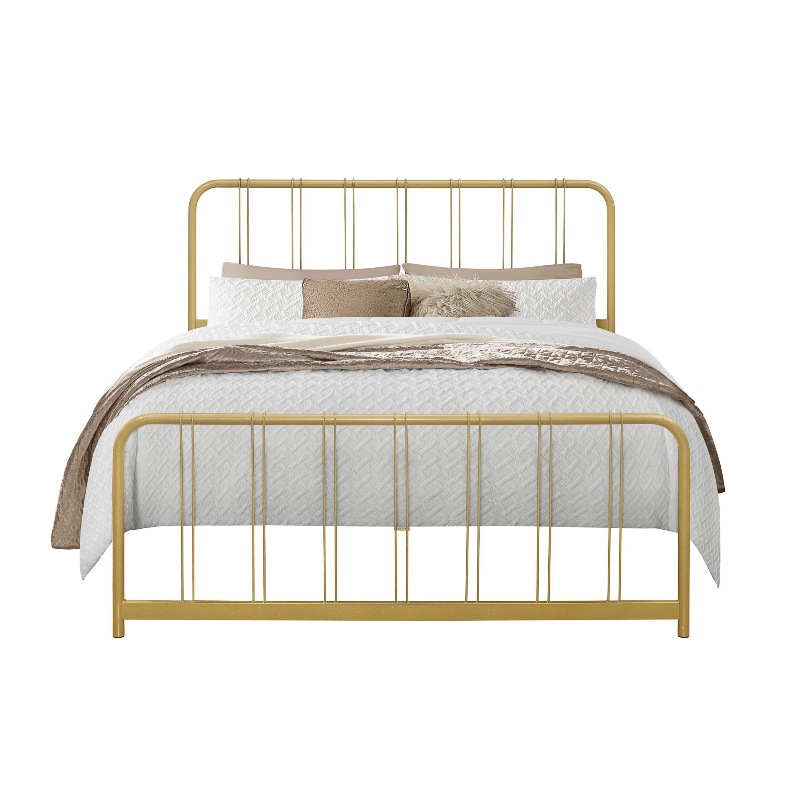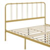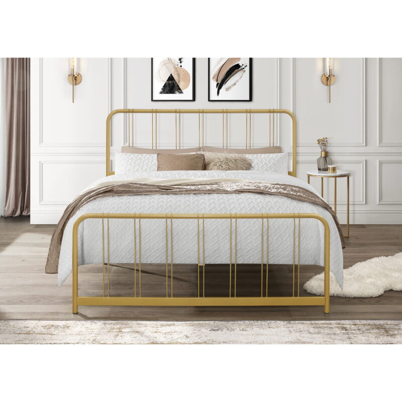 This bed frame features a sleek, industrial-inspired design that balances minimalist style with durable construction. Finished in matte black and also rich gold color, which gives it a strong visual and structural presence. Both the headboard and footboard have rounded top corners, softening the silhouette while maintaining a sturdy profile. Vertical rods add decorative interest while maintaining an open, airy feel. The wooden slat system supports a mattress without the need for a box spring, offering both breathability and even weight distribution. It’s elevated off the ground, providing additional underbed storage space.