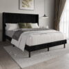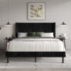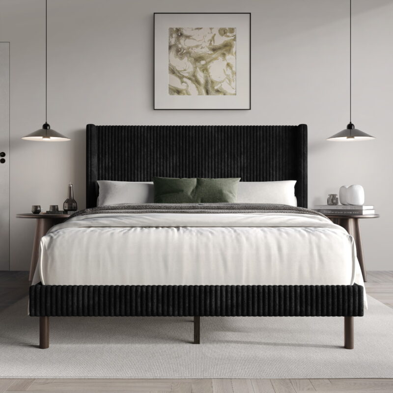 Elevate your bedroom with the inviting texture and timeless style of this corduroy upholstered wingback platform bed. Featuring a tall, ribbed headboard wrapped in soft corduroy fabric, it combines cozy charm with a refined look. The low-profile platform design eliminates the need for a box spring, offering a sleek silhouette ideal for contemporary and transitional spaces. Supported by durable wooden slats, this bed ensures long-lasting comfort and stability.