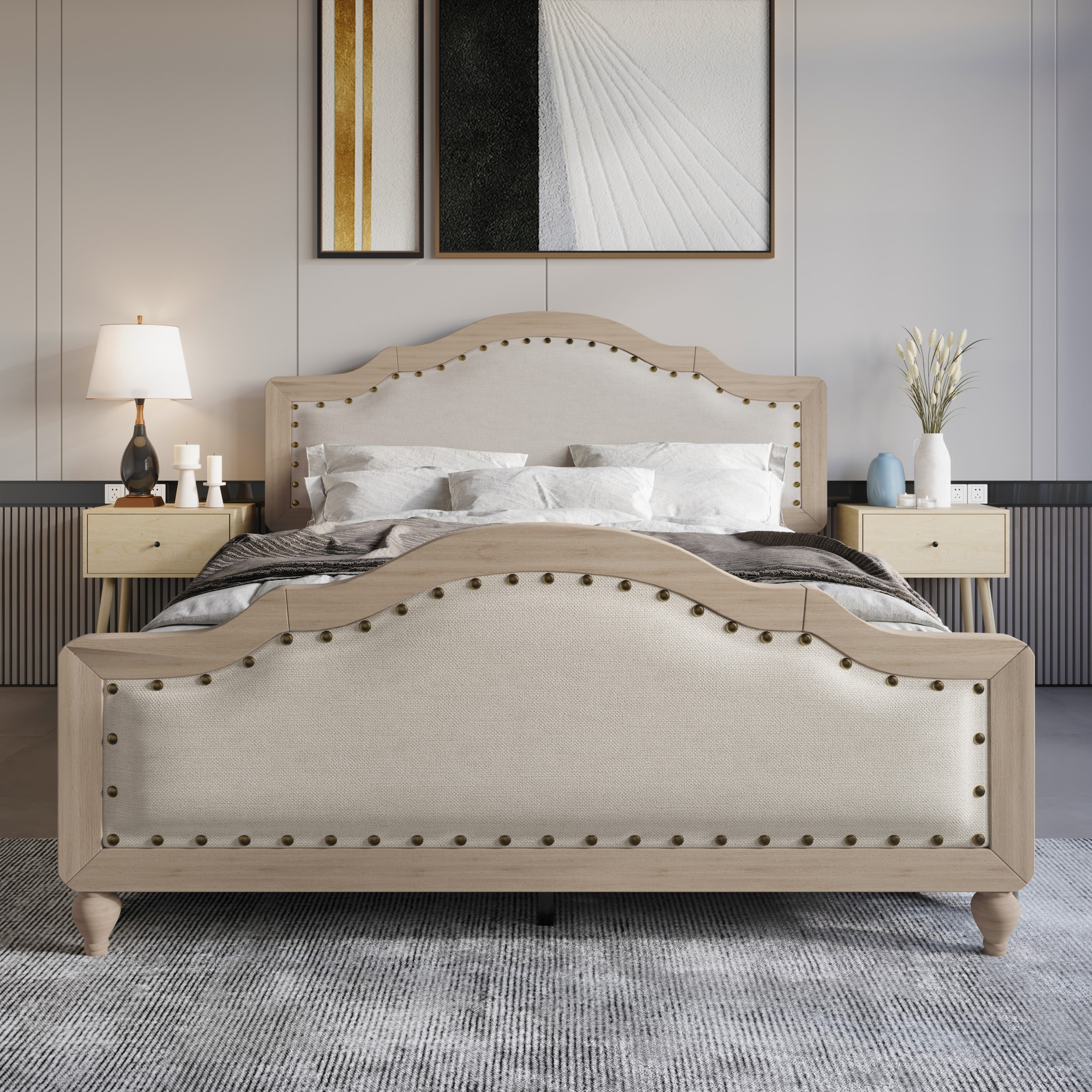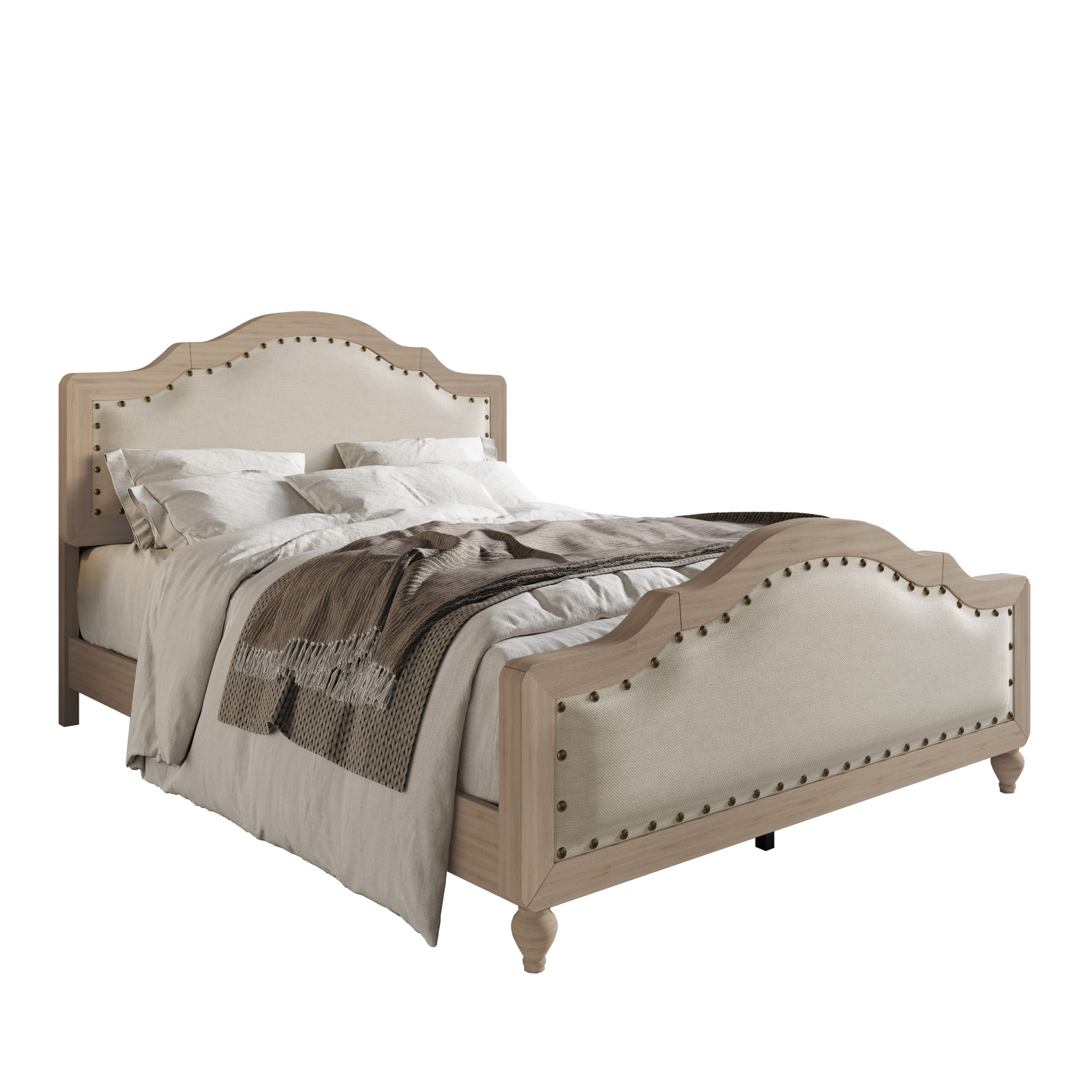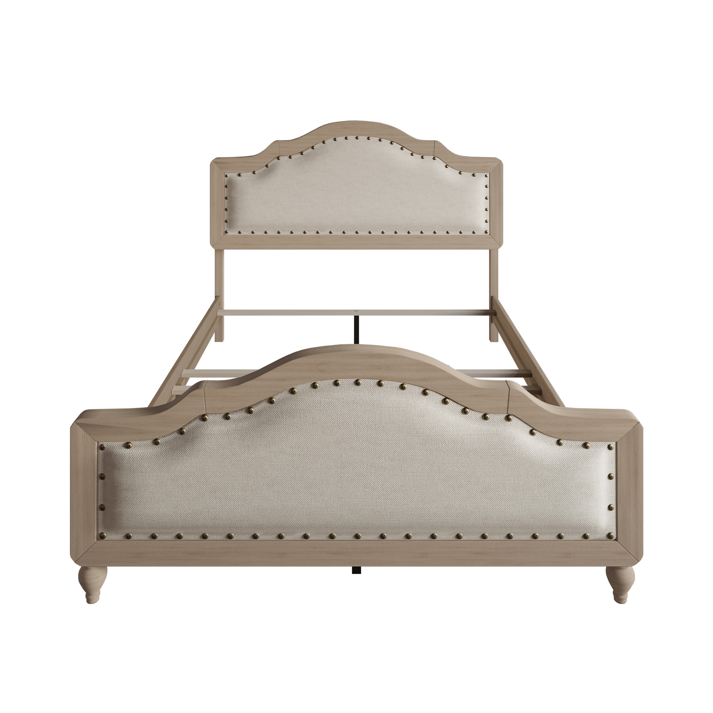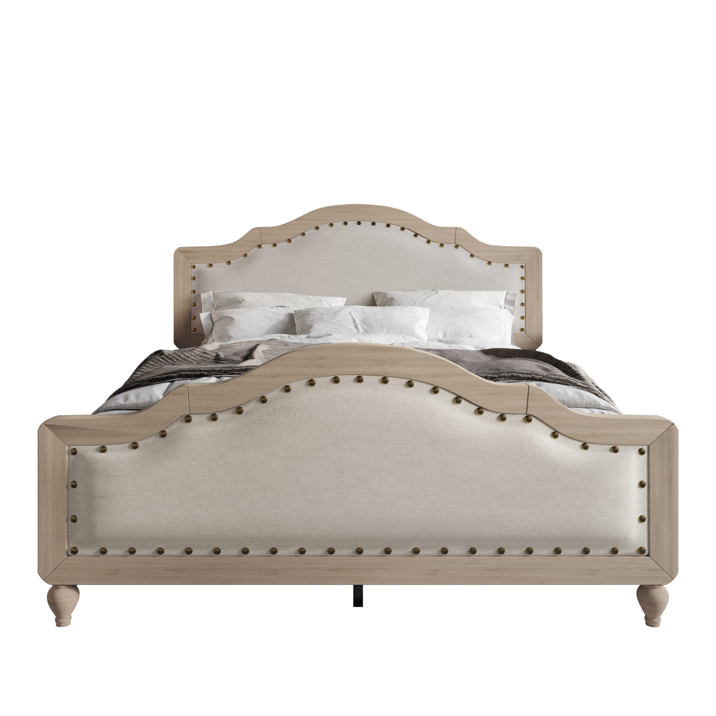 Add timeless charm and comfort to your bedroom with this elegantly designed bed. Upholstered in premium linen fabric, it features soft foam padding on both the headboard and footboard, offering a cozy and inviting touch. The classic design style is enhanced by the graceful curves and clean lines, making it a versatile fit for both traditional and transitional interiors. Decorative black brass nailhead trim outlines the headboard and footboard, adding a touch of sophistication and refined detail. Built with durable construction, this bed ensures lasting stability and support for years to come. Whether for a master suite or guest room, this piece brings together comfort, style, and quality—creating a stunning centerpiece for any sleeping space.