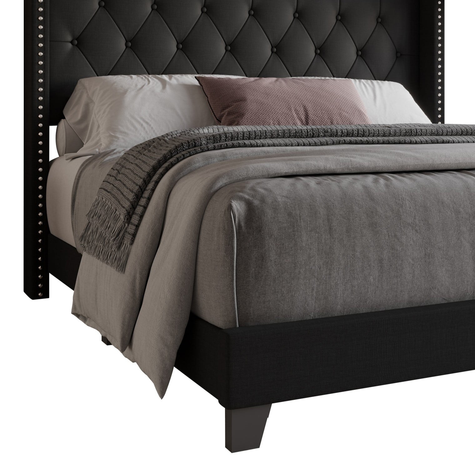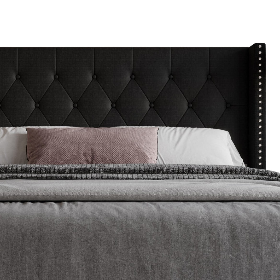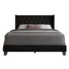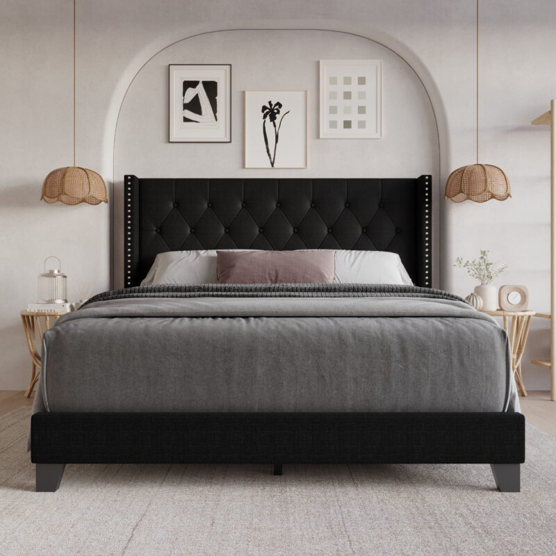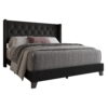 Home Design Homer King Button-Tufted Wingback Upholstered Panel Bed Frame with Nailhead Trim design for Adult, Black, Easy Assembly