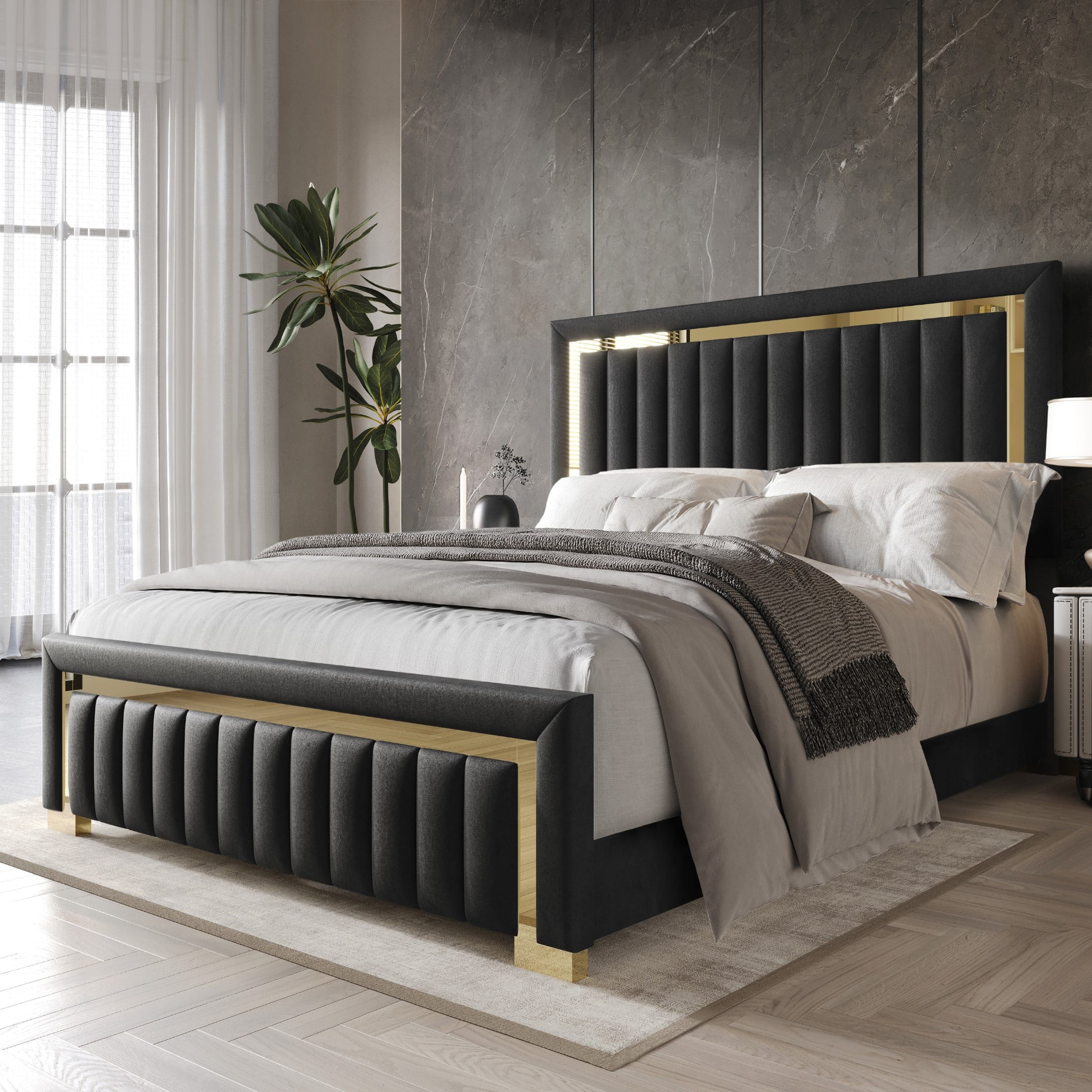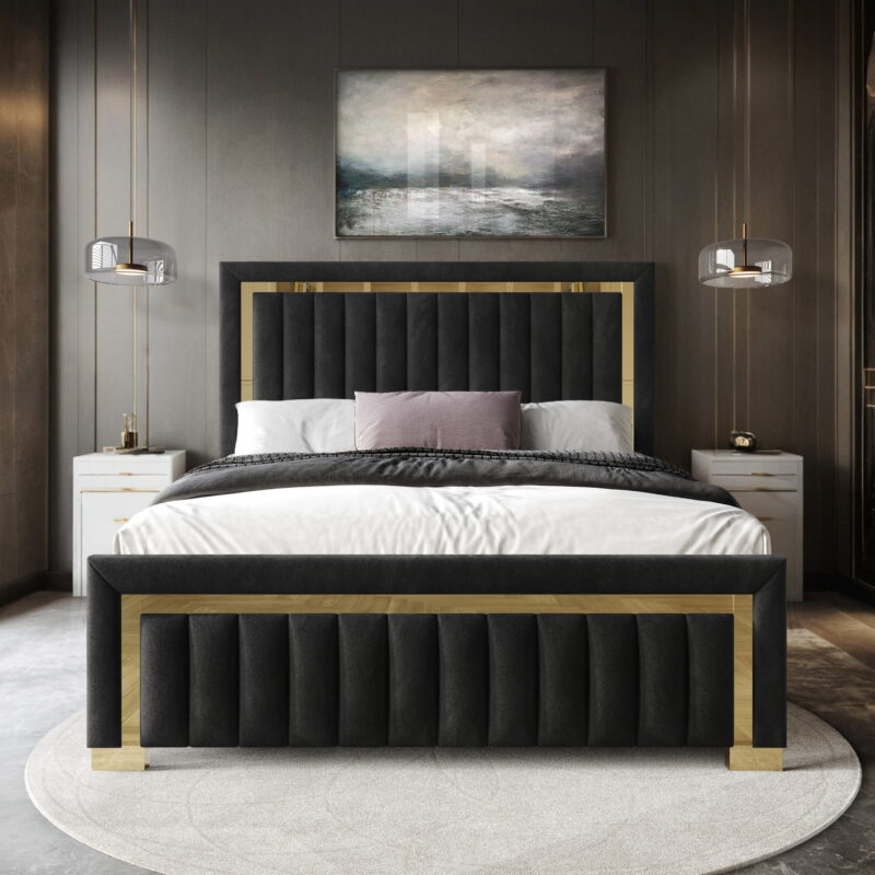 Elevate your bedroom with our upholstered panel bed, featuring a headboard and footboard adorned with a sophisticated channel-tufted design and striking gold acrylic strip accents. Wrapped in luxurious velvet fabric, the foam-filled headboard provides both comfort and elegance, making it perfect for lounging or reading. Supported by four sturdy golden block legs, this bed combines modern style with reliable durability. Available in three stunning colors and in Twin, Full, Queen, and King sizes, this bed requires a box spring (sold separately) to complete its sleek and functional design.