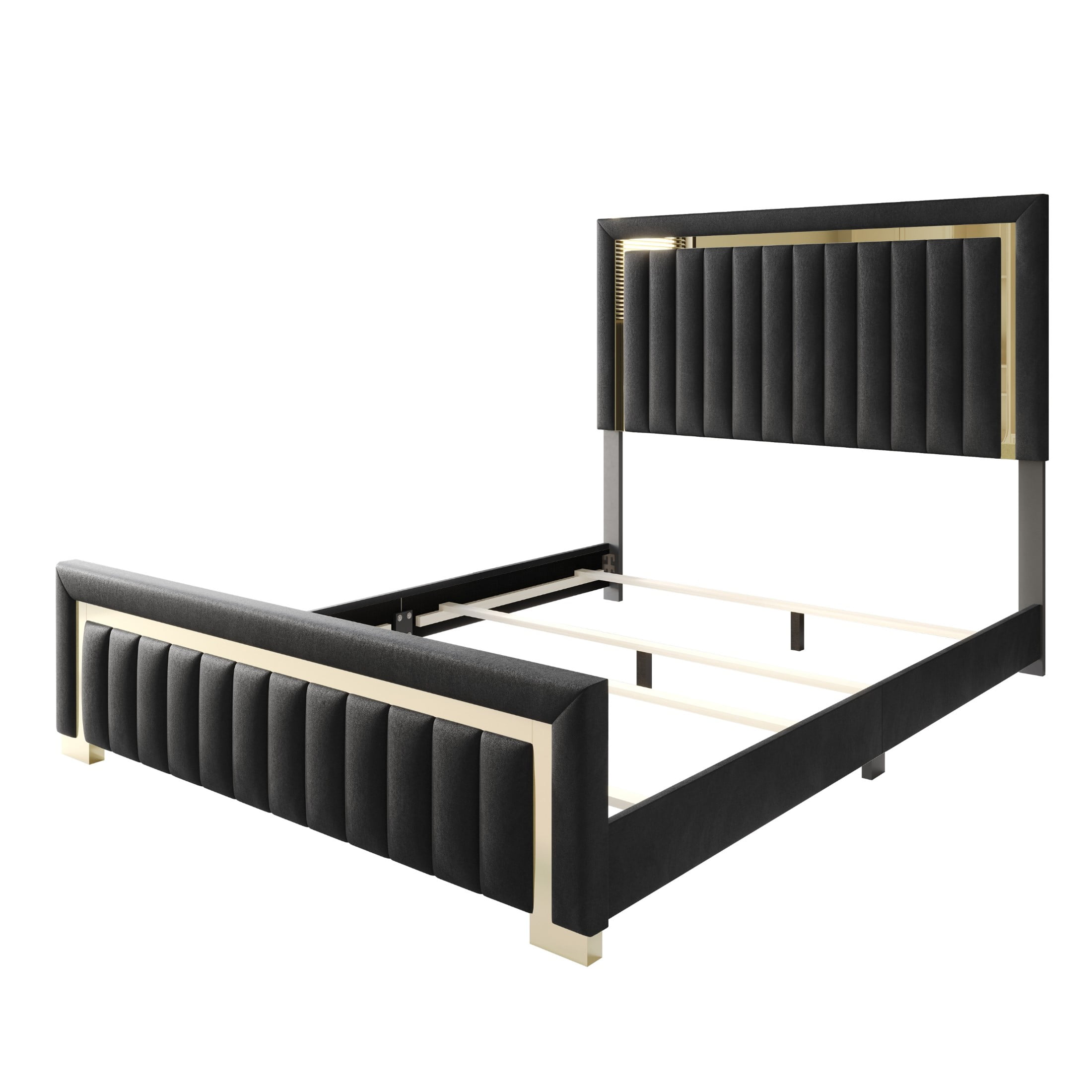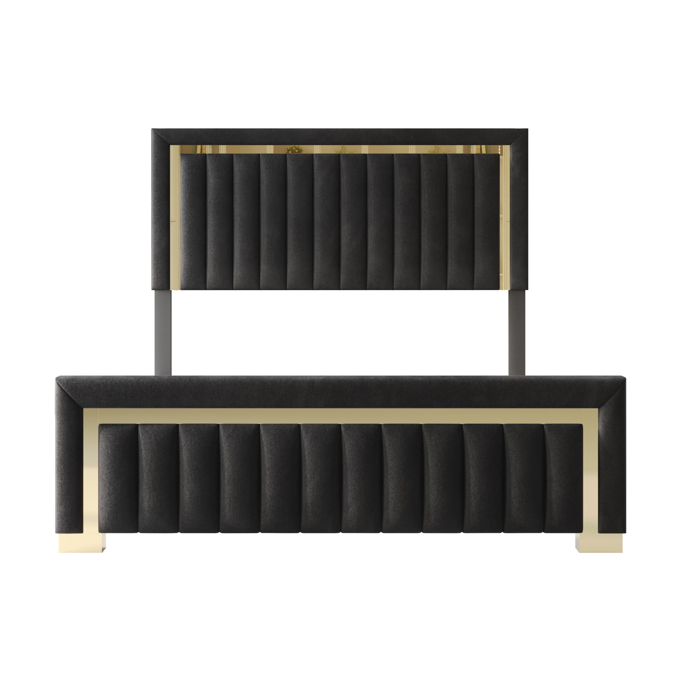 - Elegant channel-tufted headboard and footboard with gold acrylic strip accents for a modern, luxurious look.