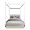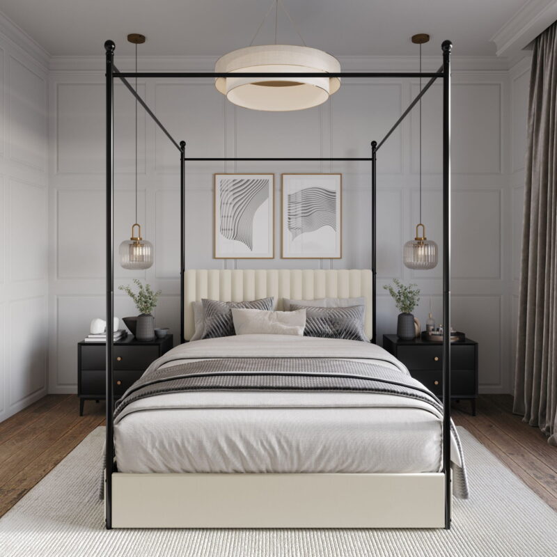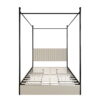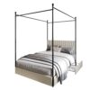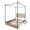 This upholstered canopy bed can transform your bedroom into a classic with a modern twist. The beautiful headboard, which is padded with foam and upholstered in high-quality linen with vertical channel tufting, offers you comfort after a long day. The four posts and under bed drawers are mainly made of metal, ensuring durability and helping you to keep your belongings neatly organized. A platform frame eliminates the need for a box spring.
