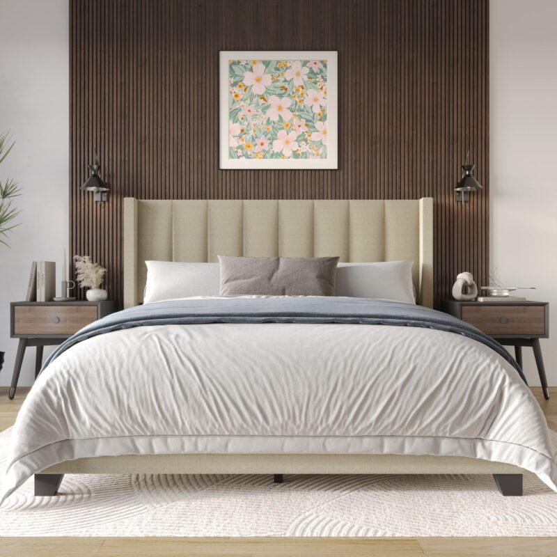 Create an instant focal point in your space with this elegant and warm upholstered platform bed. This platform bed showcases modern vertical channel tufting on the headboard, adding a tailored touch. It features sleek wingback for plenty of charm and sturdy black legs. The headboard filled with foam provides extra comfort while reading before bed. With a durable wooden slat system, eliminating the need for a box spring ensures a restful night’s sleep.