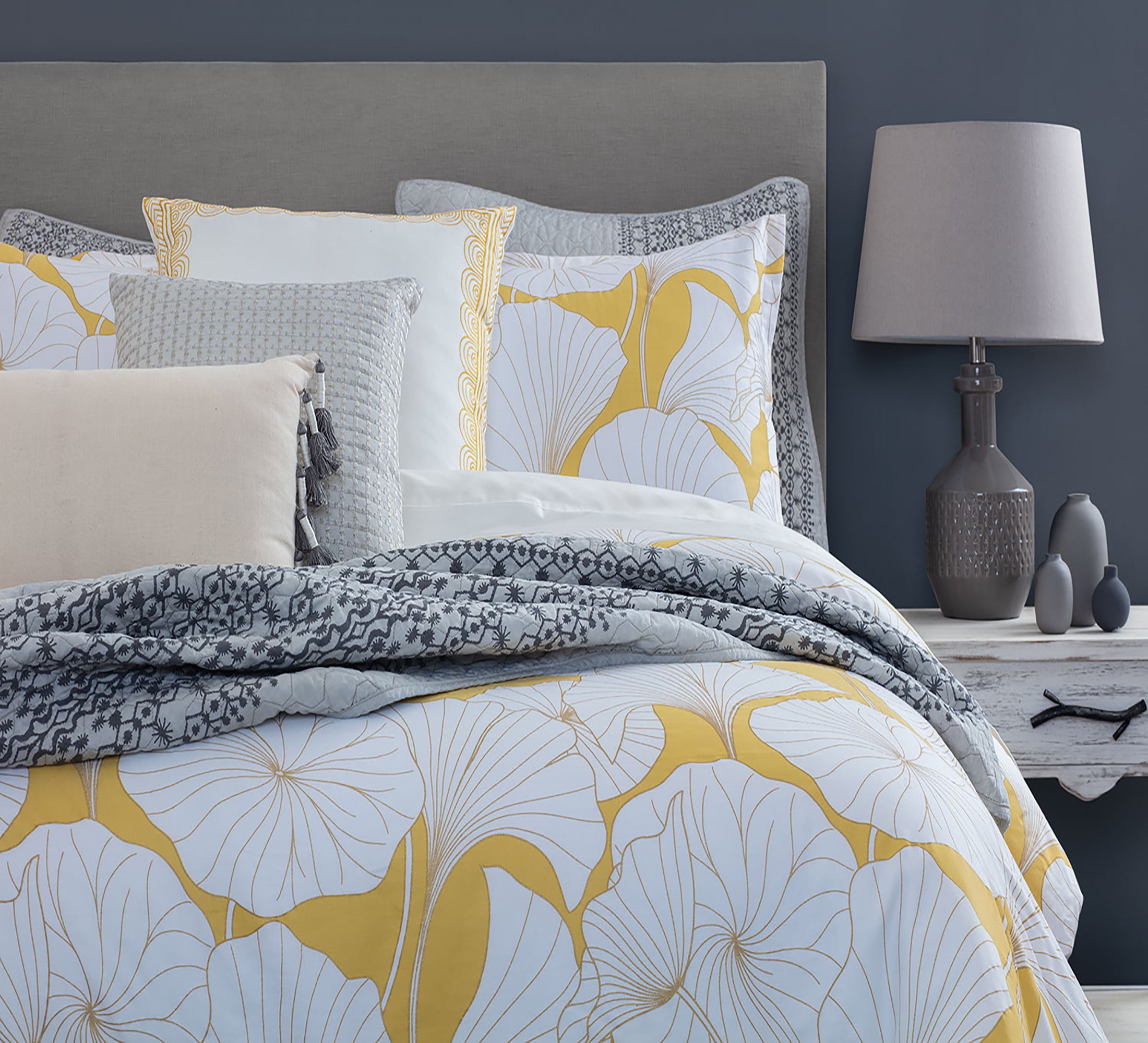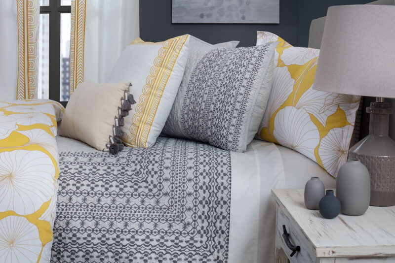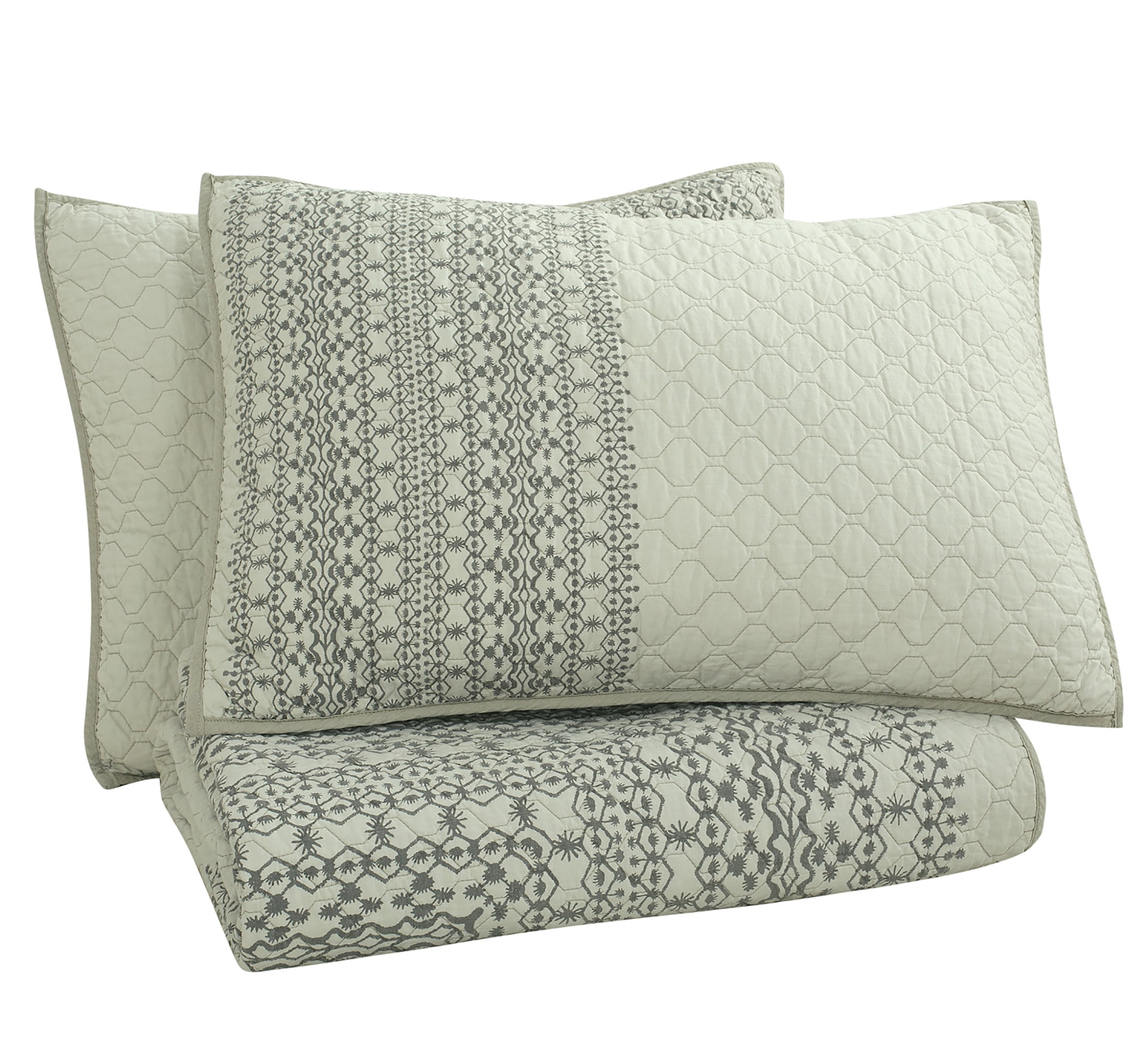 This Nikki Chu bedding collection features livable and natural looks with luxe touches to make your home feel inspired and effortlessly stylish. The Interlaken quilt and shams feature a global inspired design printed in a hotel border layout in light and medium grey tones. This quilt combines a global design with a classic layout to bring style to any bedroom, while the neutral colors will match back to anyone’s décor. This quilt set is perfect for anyone from a college student to a master bedroom. Finish the look or add style to any room in your house with coordinating Nikki Chu embroidered decorative pillows and window panels, each sold separately.