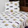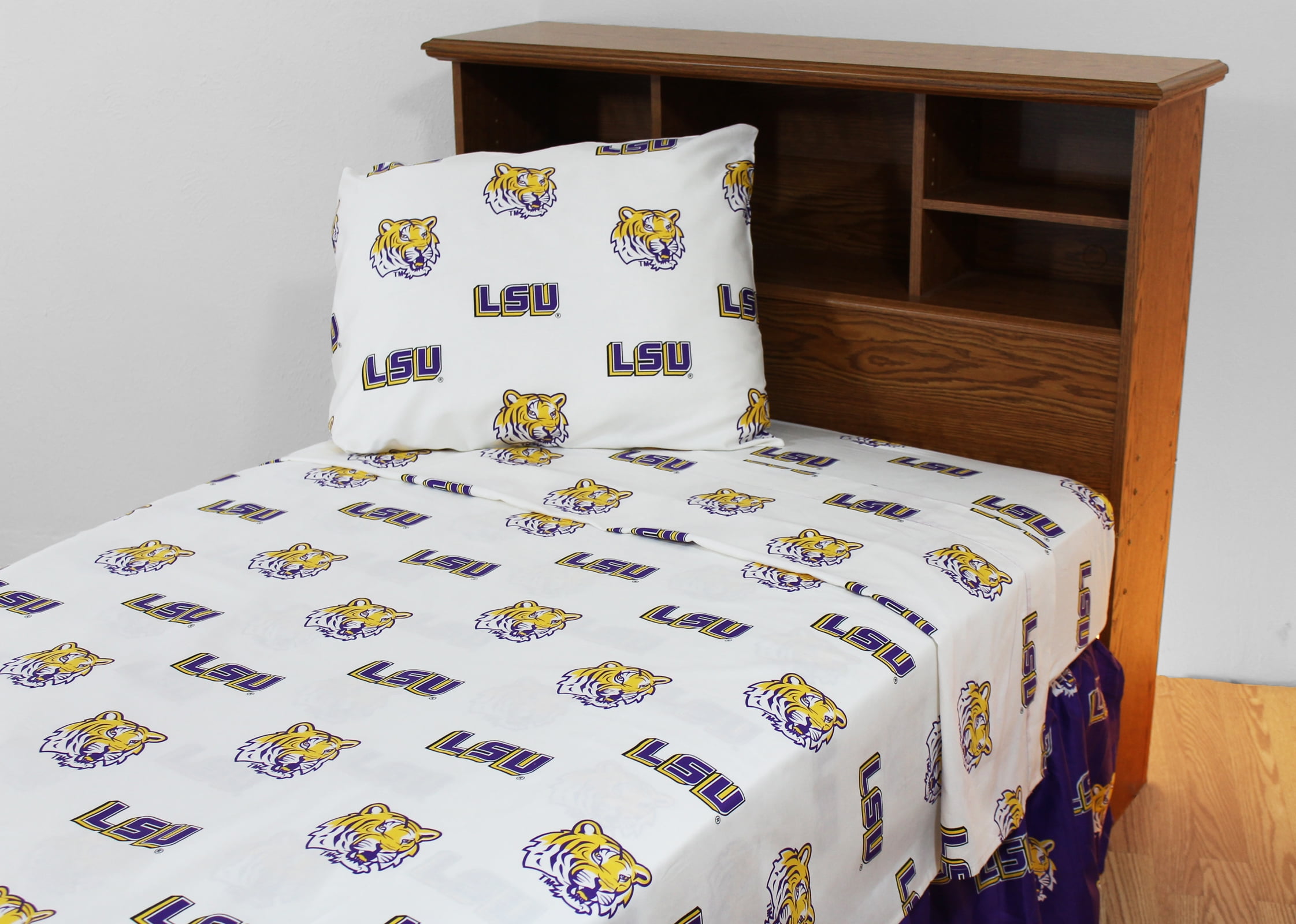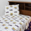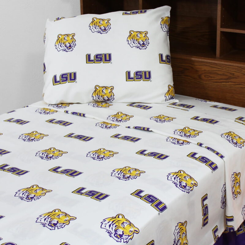 LSU Tigers licensed, College Covers brand sheet set includes 1 flat sheet, 1 fitted sheet and 2 pillowcases. All made from 100 percent cotton, 200 thread count material, our sheets sets are machine washable with like colors in cold water and should be tumble dried on a low heat. The flat sheet measures 90 inches by 101 inches, the fitted sheet measures 60 inches by 80 inches by 12 inches deep to fit almost all mattresses. Imported.
