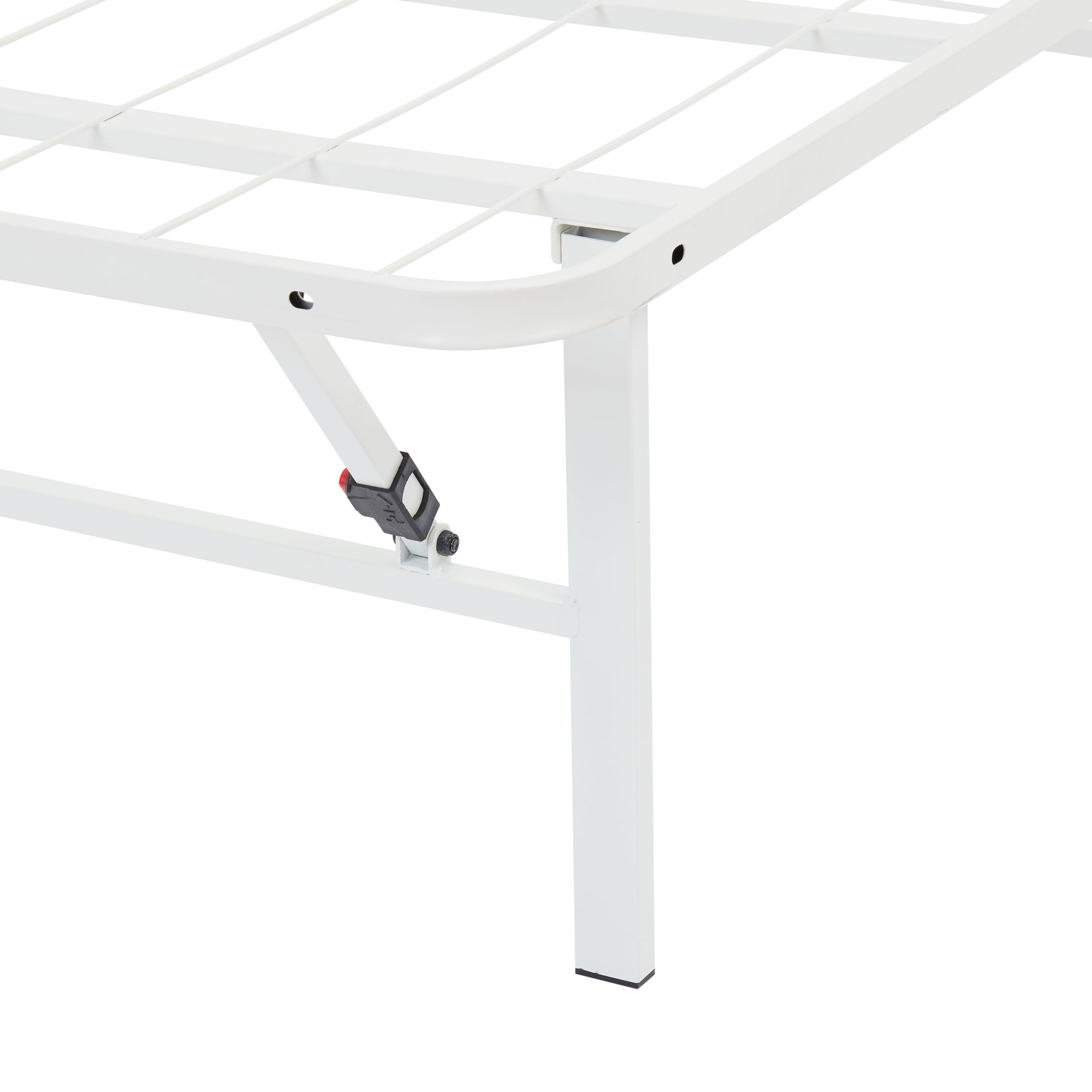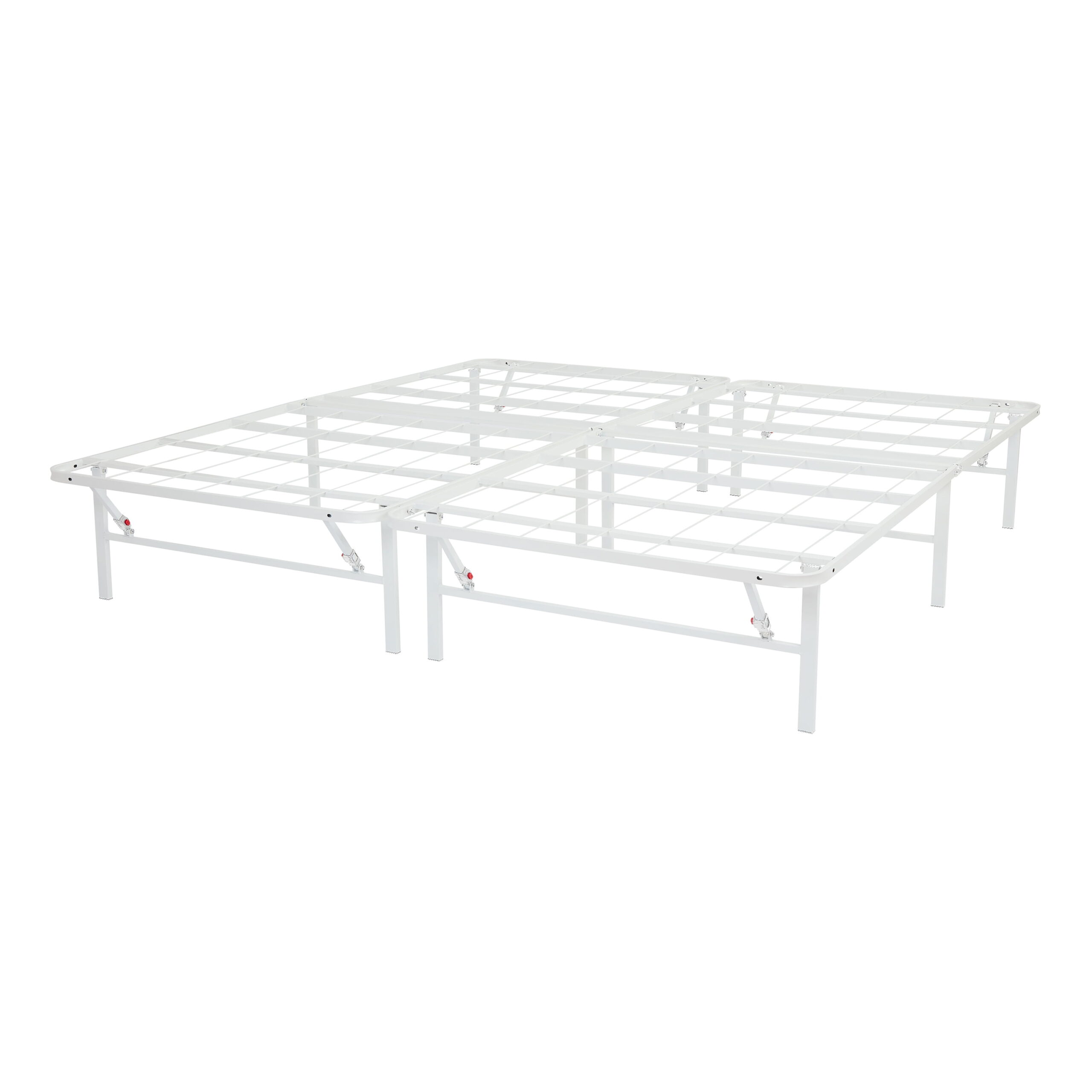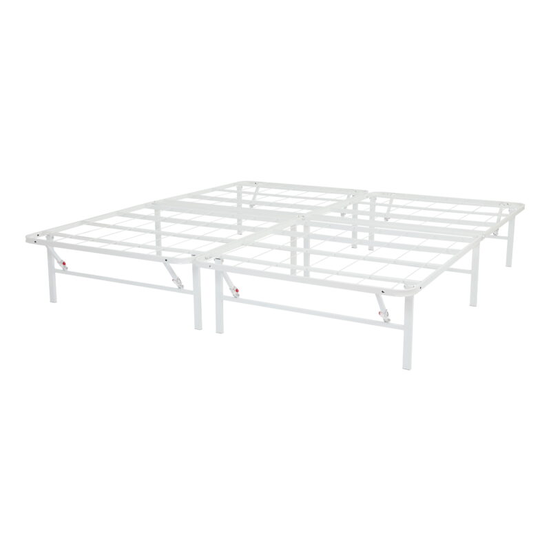 Make the most out of your mattress with the innovative and durable design of Mainstays High Profile Foldable White Steel Platform Bed Frame, constructed of powder-coated heavy-duty steel, that uniquely uses a reliable mesh platform that allows you to place your mattress directly onto the frame without a box spring. This bed frame is quick and easy to assemble with no tools required, features a button locking system on legs that keeps the bed fully sturdy and easily folds in half for transport and storage. The Mainstays 14″ Foldable high profile Bed Frame creates a storage opportunity under your bed and stands on capped feet to minimize damage to floors, you and your family are sure to appreciate the durable, sturdy design of this High-Profile Foldable Steel Bed Frame from the home experts at Mainstays. Available in Twin, Twin XL, Full, Queen, King, and California King.