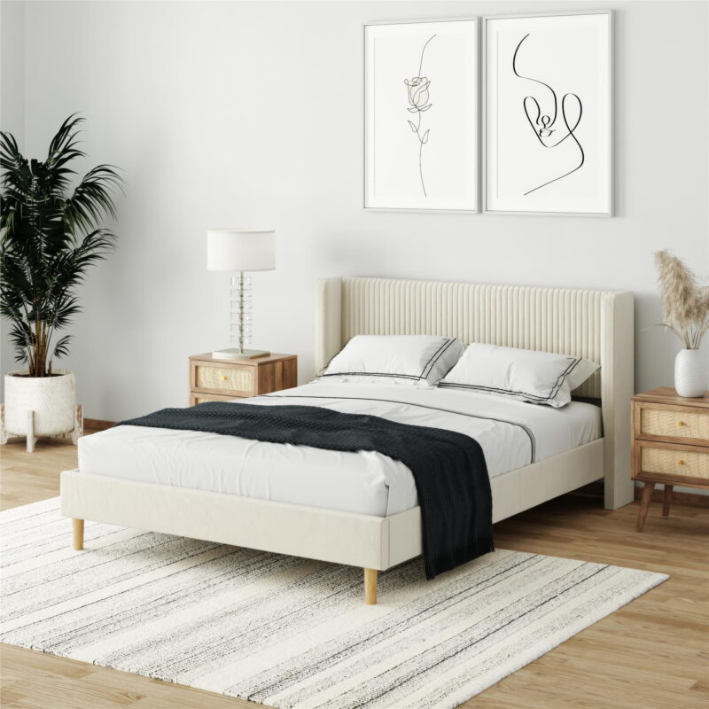 - MASTER SUITE MASTERPIECE: Beautify your bedroom or guestroom with our modern upholstered platform bed frame, featuring a grand channel tufted wingback headboard with fully upholstered back legs and front, tapered solid wood legs for a polished touch