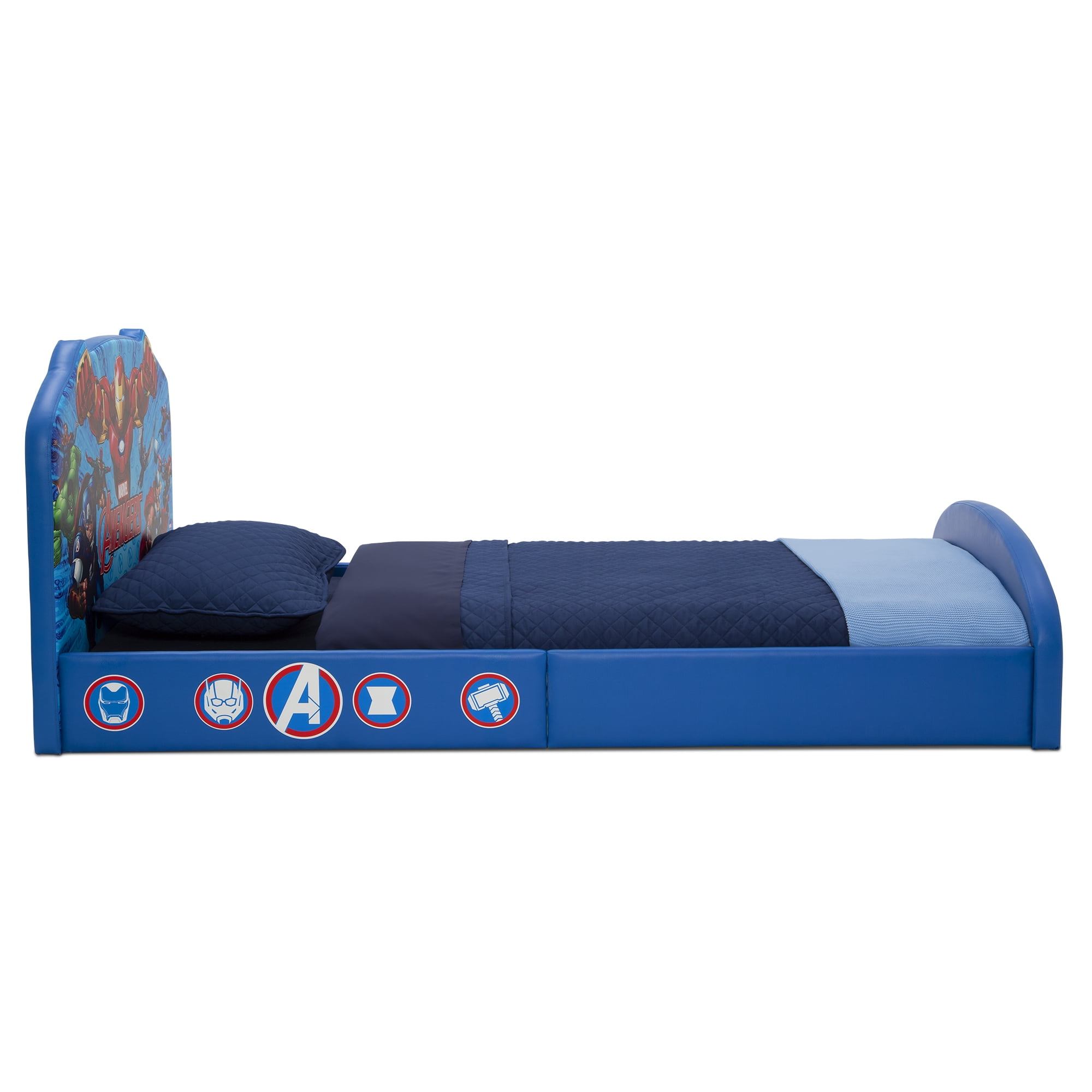 This Marvel Avengers Upholstered Twin Bed by Delta Children offers the ultimate retreat for your superhero-in-training. Featuring your child’s favorite superheroes, the headboard and footboard are adorned with vibrant graphics of Iron Man, Captain America, Thor, Hulk and more. Fully upholstered in faux leather, this bed adds some crime-fighting adventure to their sleep space. For your child’s safety, this bed is designed for the mattress to sit on the floor inside the bed frame. Cozy, durable and colorful, it’s the perfect twin bed for the hero in your life.
