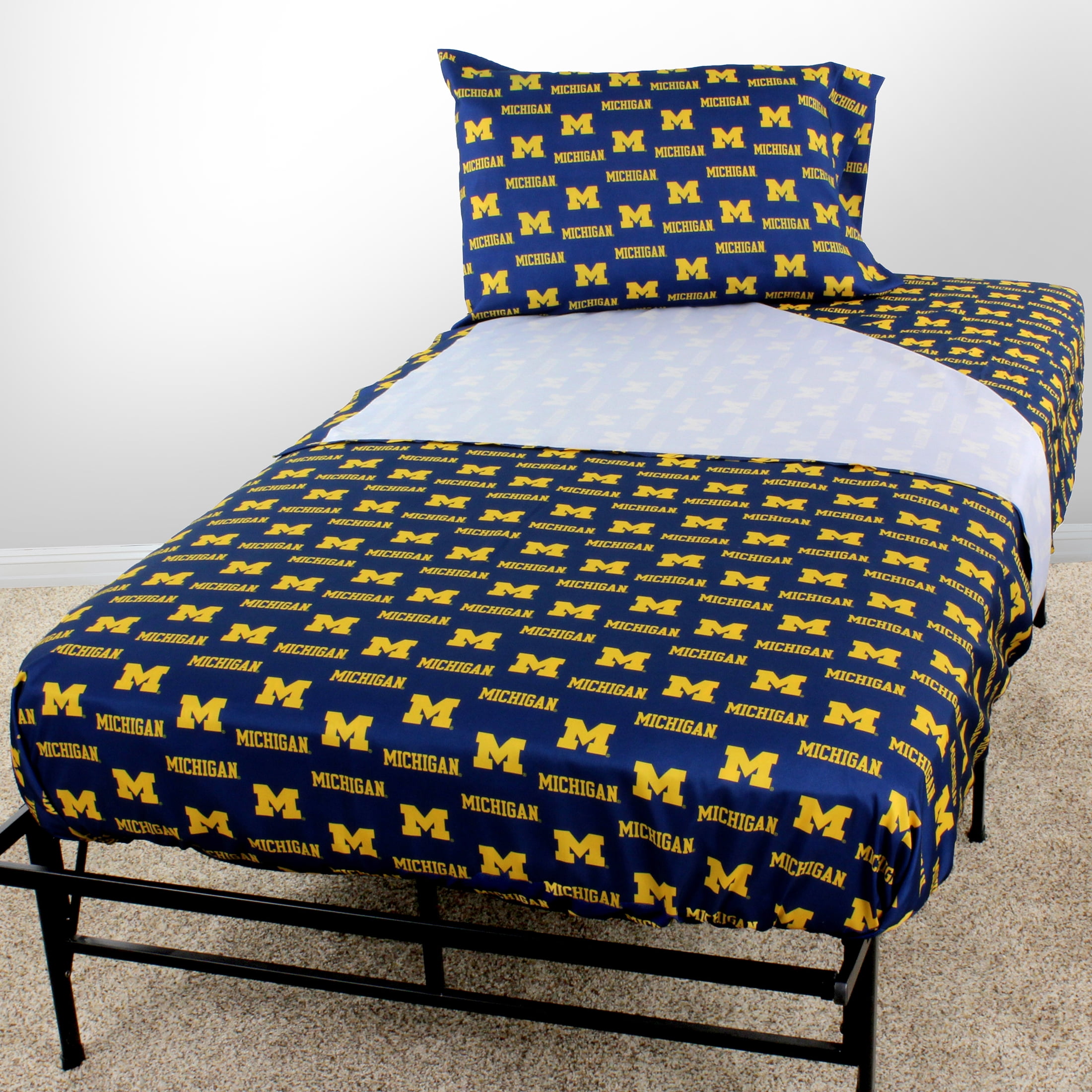 Michigan Wolverines licensed, College Covers brand sheet set includes 1 flat sheet, 1 fitted sheet and 2 pillowcases. All made from 100 percent polyester material, our sheets sets are machine washable with like colors in cold water and should be tumble dried on a low heat. The flat sheet measures 90 inches by 101 inches, the fitted sheet measures 60 inches by 80 inches by 12 inches deep to fit almost all mattresses. Imported.