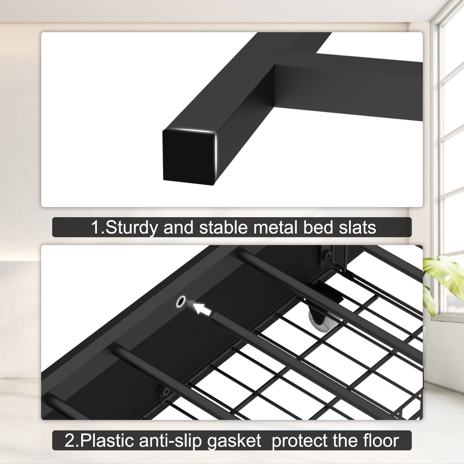 2 UNDERNEATH STORAGE DRAWERS: Equipped with 2 large-capacity storage drawers under the bed frame. Each has 4 smooth wheels that can be easily pulled out and closed, making it easy to store all kinds of bed linen, clothes, etc. Each drawer is also designed with a closing buckle, that prevents closed drawers from opening indiscriminately.