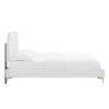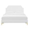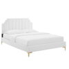 Bring vintage modern elegance and glam deco style to your master bedroom or guest bedroom with the Sienna Performance Velvet Queen Platform Bed. Featuring vertical tufting, a unique silhouette, and luxurious texture, the padded headboard of this queen size bed offers supportive comfort while relaxing in bed. Covered in stain-resistant performance velvet, this upholstered bed is a sturdy mattress foundation for memory foam, innerspring, latex, and hybrid mattresses. Eliminating the need for a box spring, the MDF frame of this platform bed is complete with a wood slat support system crafted with poplar for lasting durability and support. This slatted bed frame rests on gold metal legs with non-marking foot caps and includes a reinforced center beam with two support legs for enhanced stability. Assembly required. Queen Bed Weight Capacity: 800 lbs.